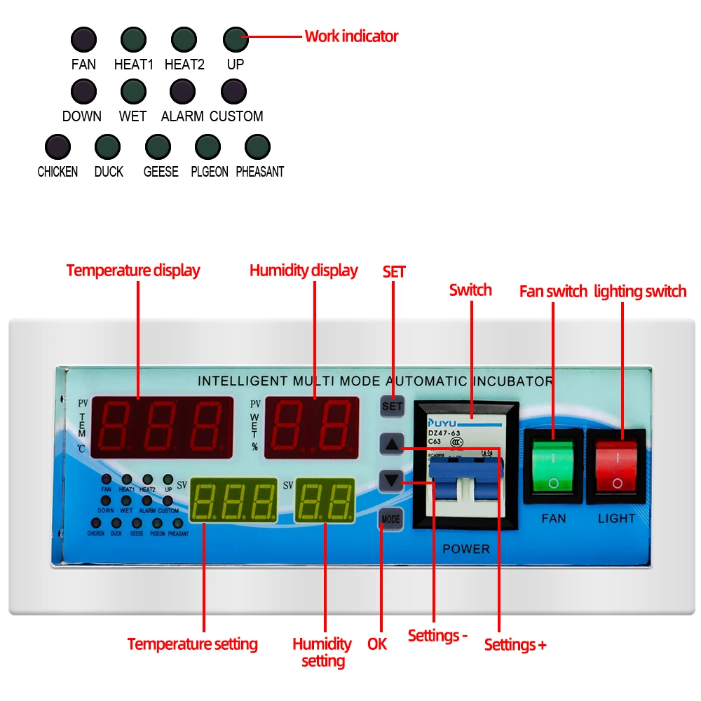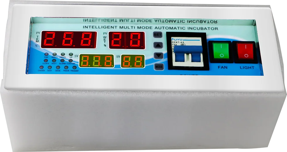 El controlador inteligente de incubadora de humitos de nueva generación es un sistema de control de microcomputadora totalmente inteligente diseñado y desarrollado para la industria de incubación y aplica la última tecnología microelectrónica y componentes de nuevo tipo.Aplica los chips de la microcomputadora para tener una fuerte antiinterferencia y un alto rendimiento estable;el sensor de temperatura aplica el sensor de alta precisión para tener una precisión de recolección de alta temperatura y un amplio rango de temperatura;Aplica un sensor de humedad de alto rendimiento a alta precisión para garantizar eficazmente la estabilidad y confiabilidad.Tiene el diseño de cuatro pantallas fáciles de usar para visualización, incluidas dos pantallas que muestran la temperatura y la humedad de la incubadora y otras dos pantallas que muestran las horas de giro y los días de incubación del huevo presionando las teclas y mostrando la temperatura y humedad preestablecidas presionando las teclas.Y seis tipos de modos de incubación para definición del usuario, pollo, pato, ganso, paloma y gallina negra están disponibles para seleccionar.