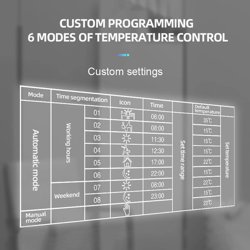 Admite 5+2, 6+1 o 7 días programable semanal, ajuste de temperatura de control programable de seis períodos.