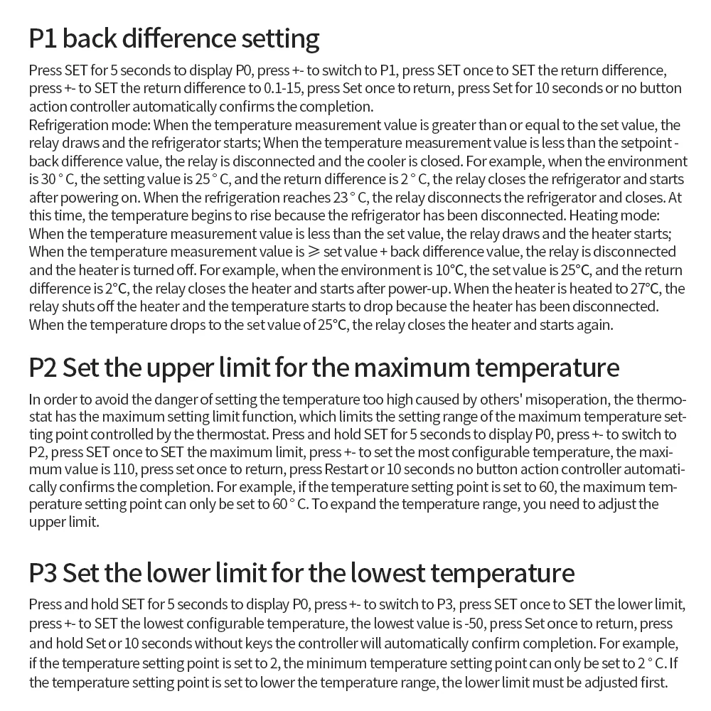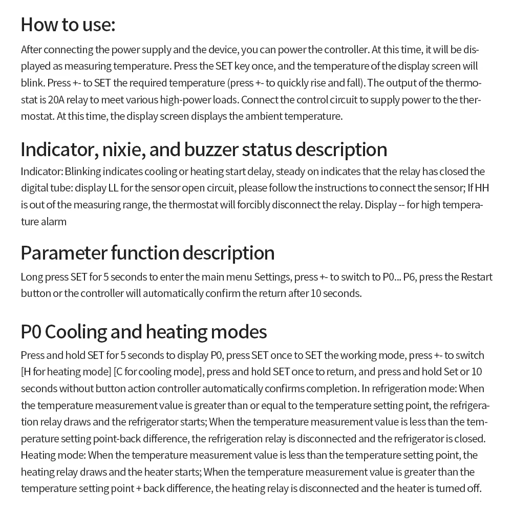 Set: Presione brevemente el pequeño tubo digital "SET" parpadea, presione "+" o "-" para ajustar la temperatura deseada, presione la tecla "SET" o ninguna operación dentro de 3 segundos para guardar la configuración.