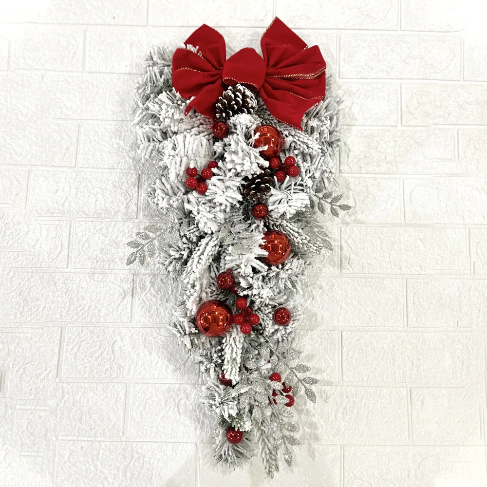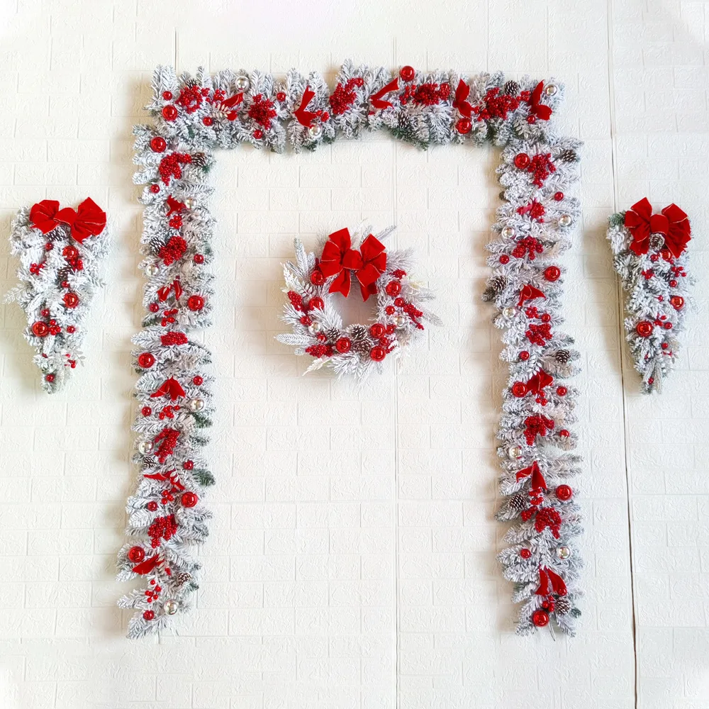 Cada CORONA DE Navidad artificial con cuatro tamaños de adornos rojos y blancos brillantes. Piñas flocadas, racimos de bayas rojas y más cintas rojas anidadas entre plantas verdes, se parece al patrón de crecimiento de las ramas.