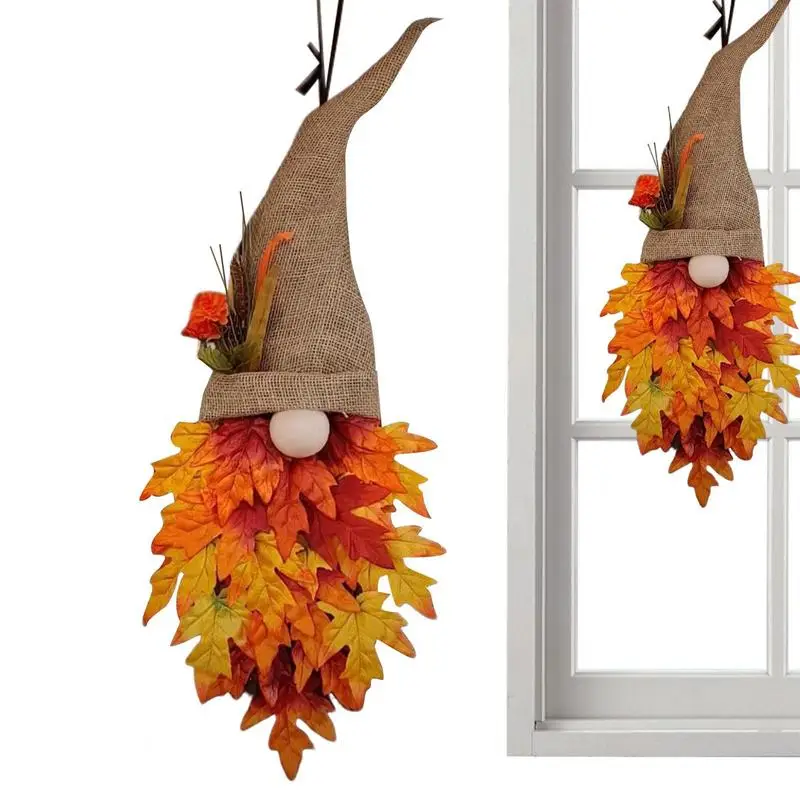 2. Corona de Gnomo de otoño: con un encantador Gnomo en el centro, esta corona es un complemento perfecto para tus decoraciones de otoño. El follaje de Hojas de arce drapeadas en colores cálidos de Otoño de una base de arpillera enrejada crea un encanto rústico natural que trae la belleza de la temporada a su puerta o pared.
