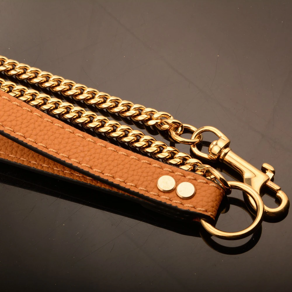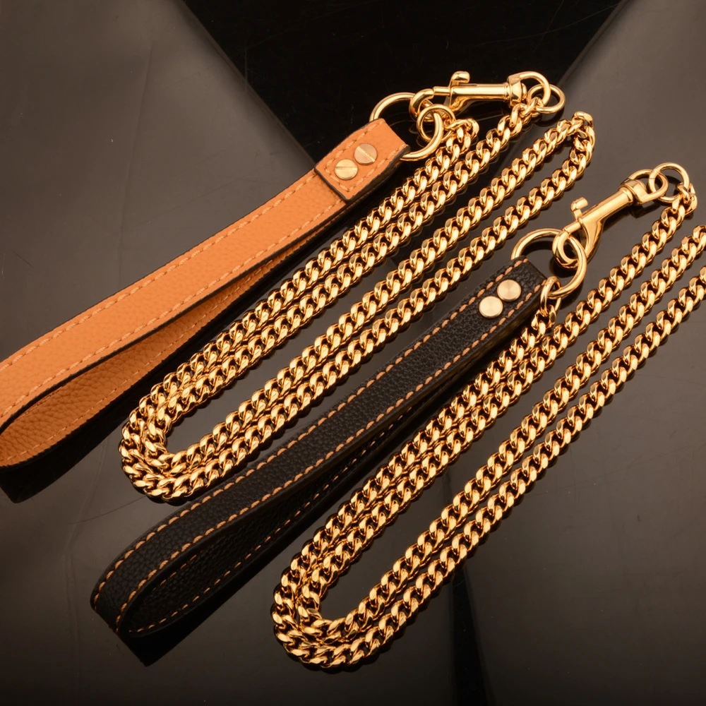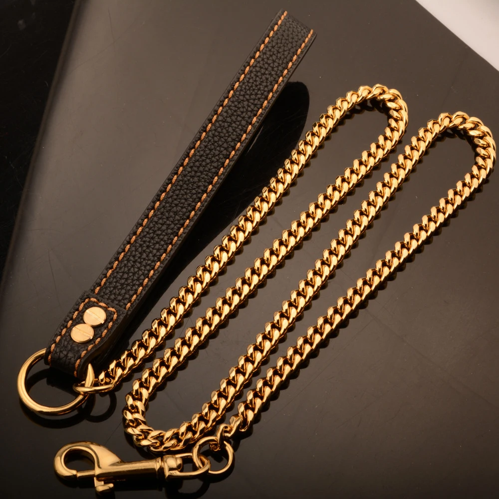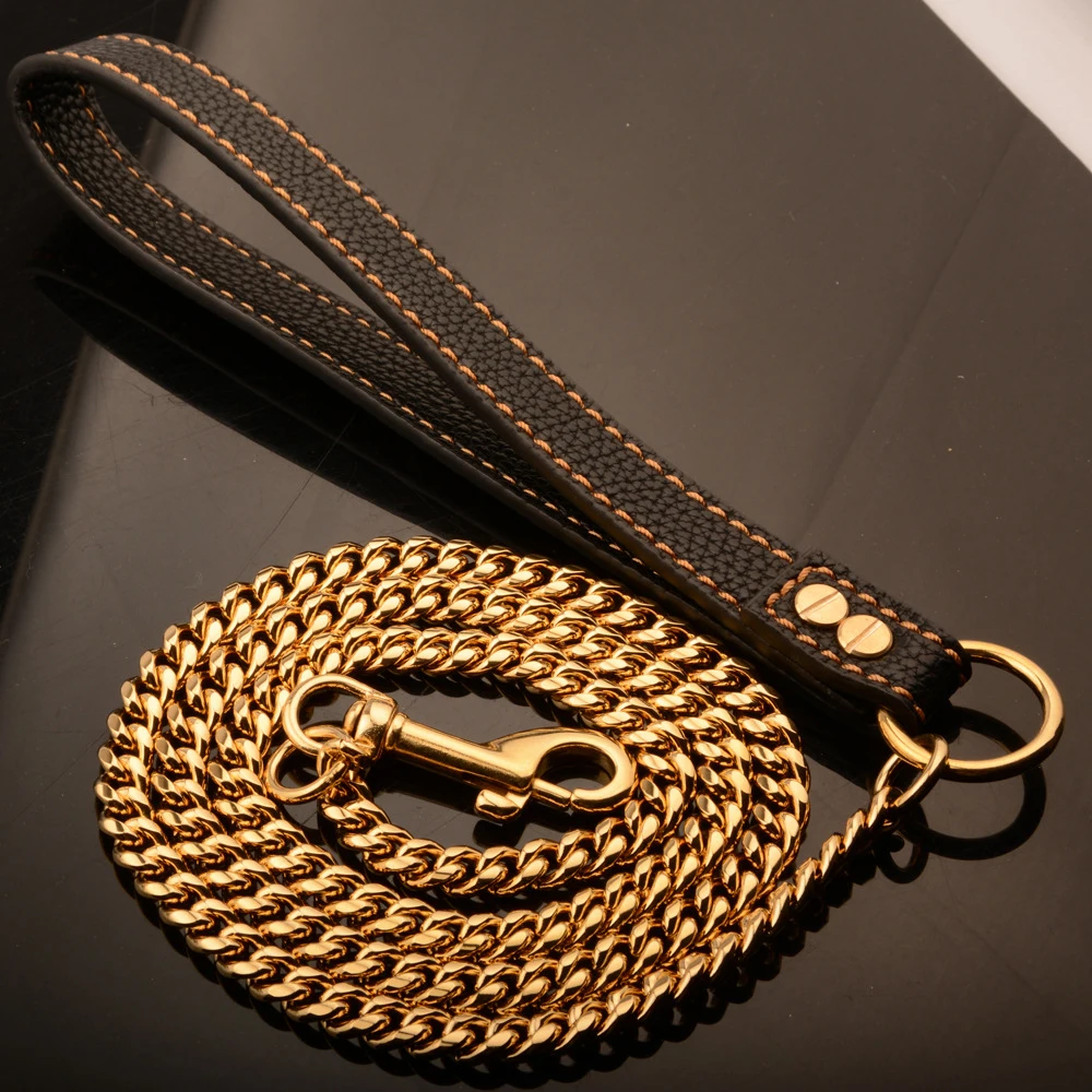 Cadena de oro para mascotas de acero inoxidable, correas para perros, mango de cuero, Correa portátil, correas de cuerda, cachorro, perro, gato, entrenamiento, Collar antideslizante, suministros 10A
