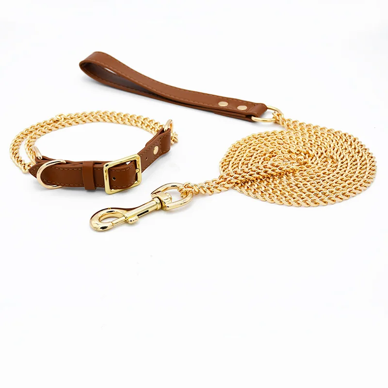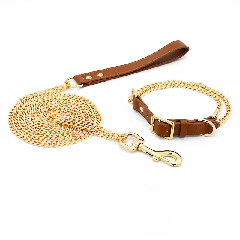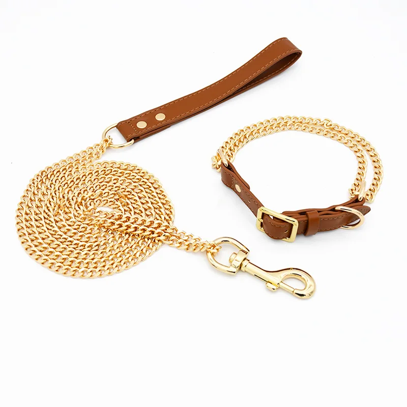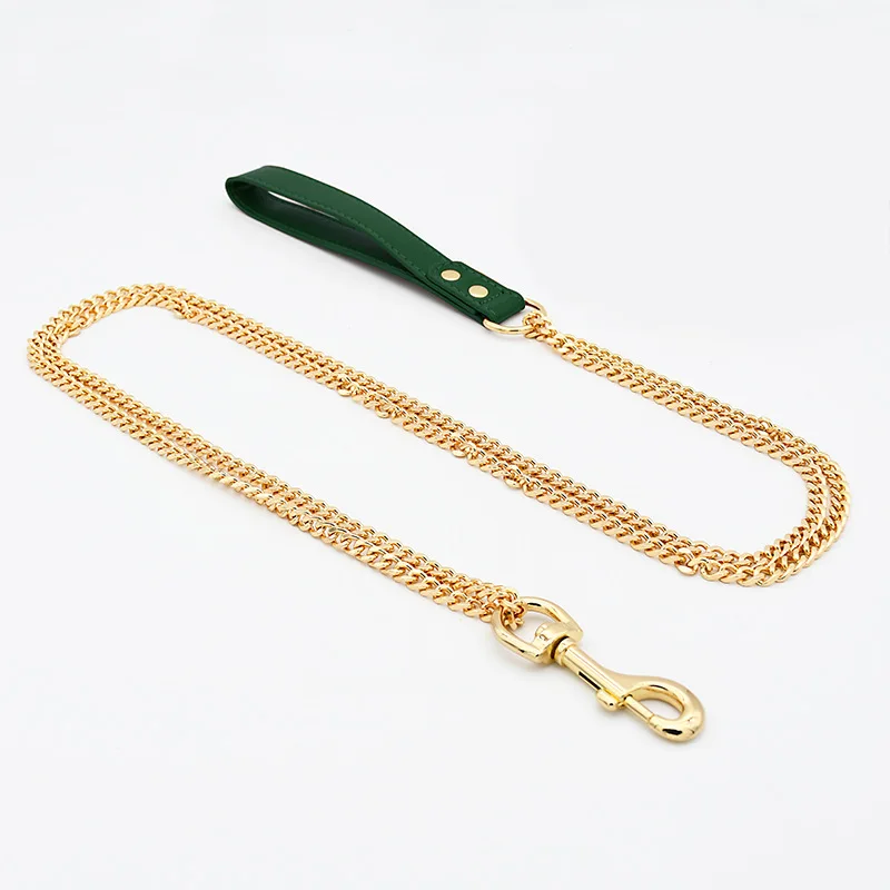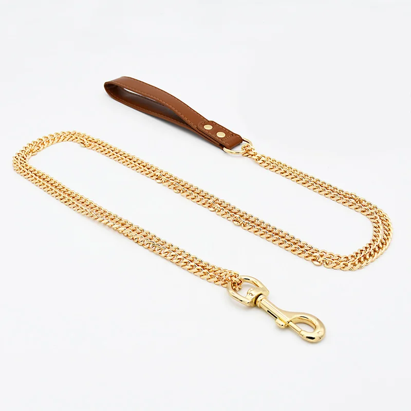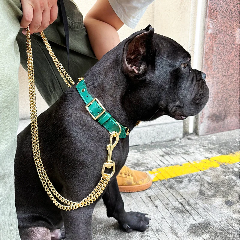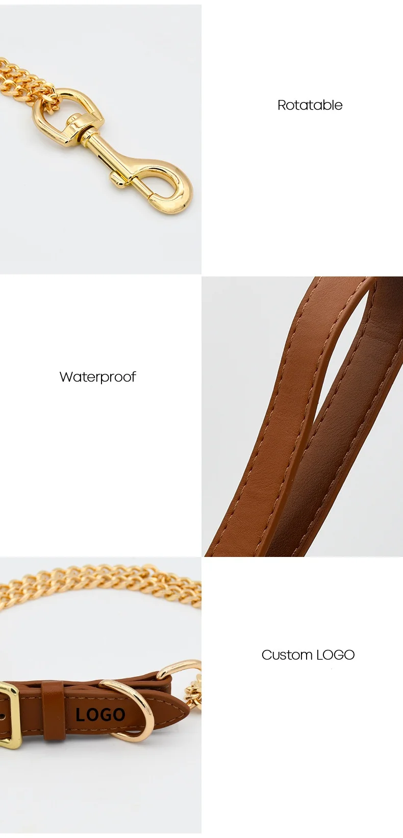 Correa de cadena dorada para perro con mango de cuero, cadena de acero inoxidable, Collar antiescape para perro P, juego de collar de correa de cadena doble de metal