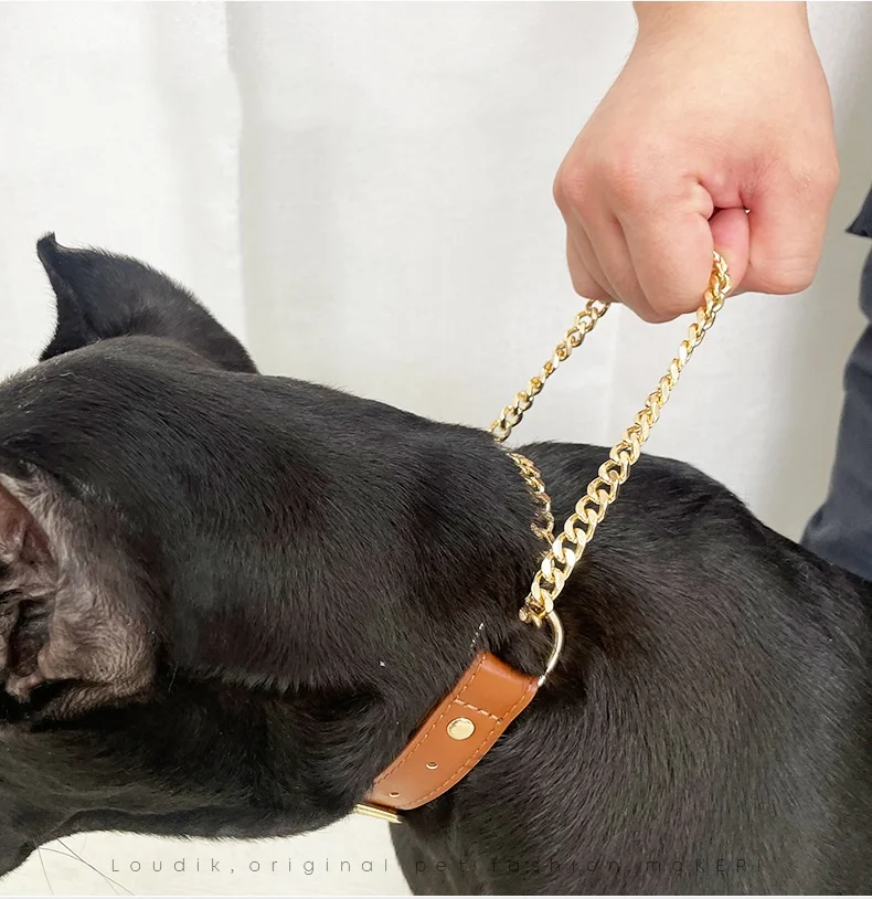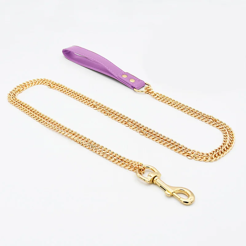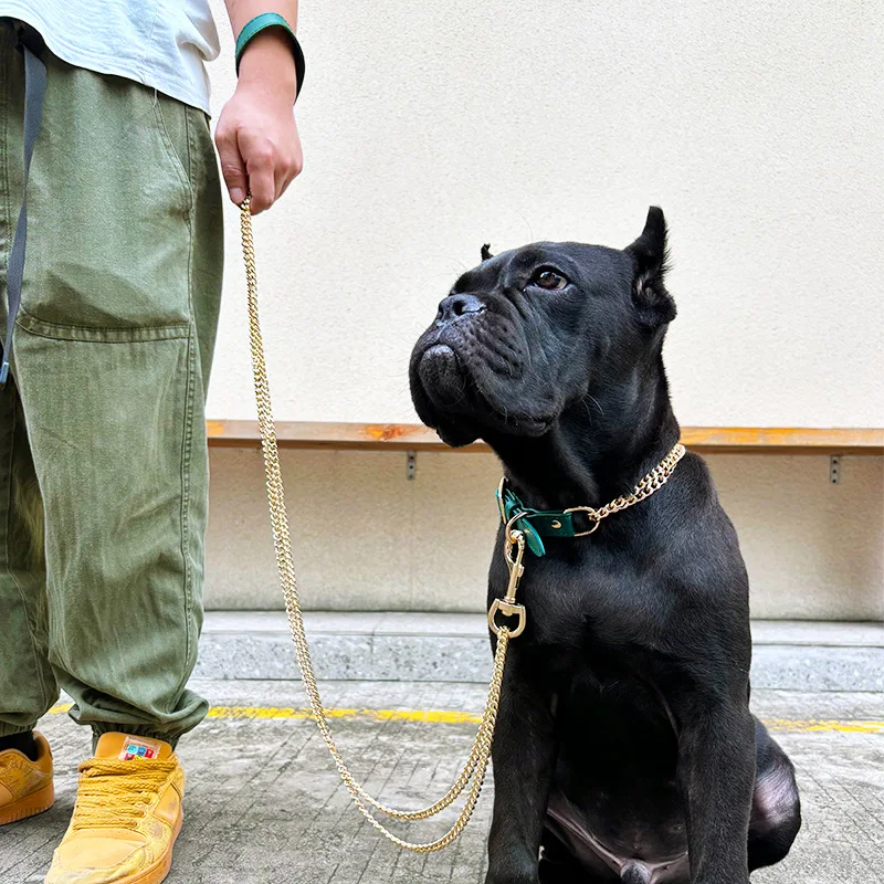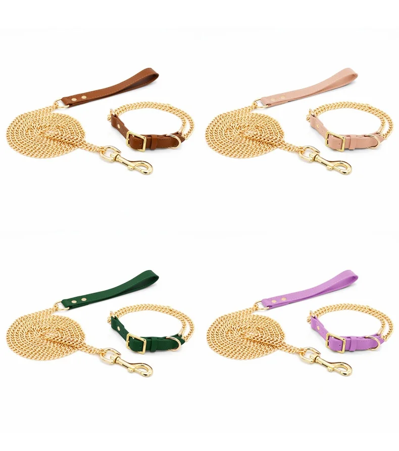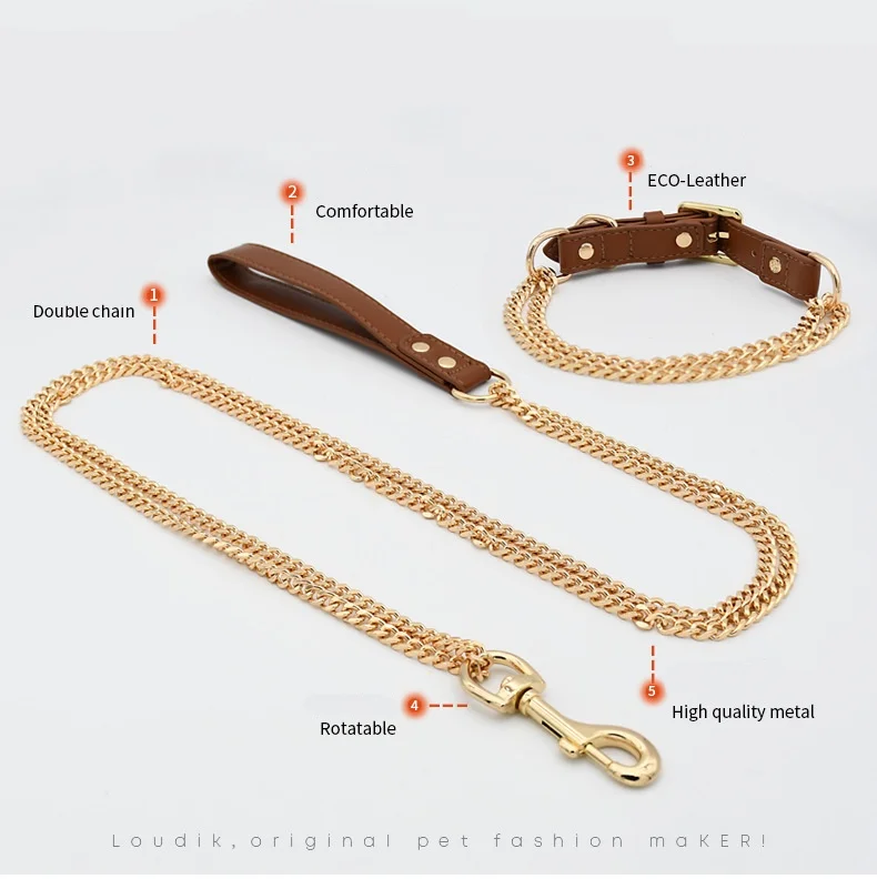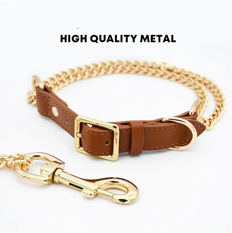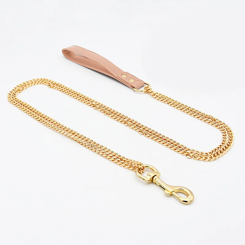 Correa de cadena dorada para perro con mango de cuero, cadena de acero inoxidable, Collar antiescape para perro P, juego de collar de correa de cadena doble de metal