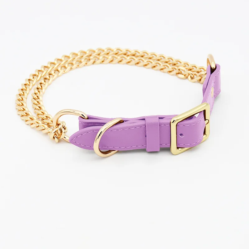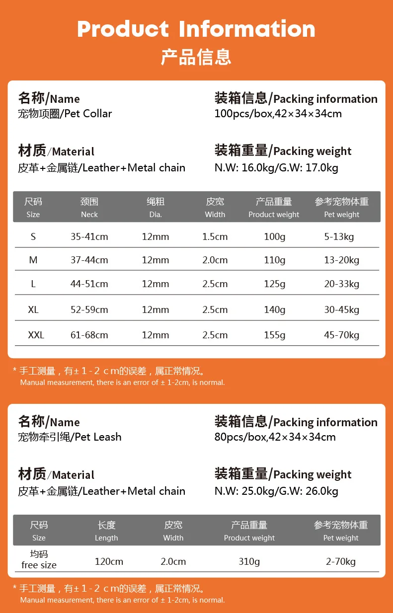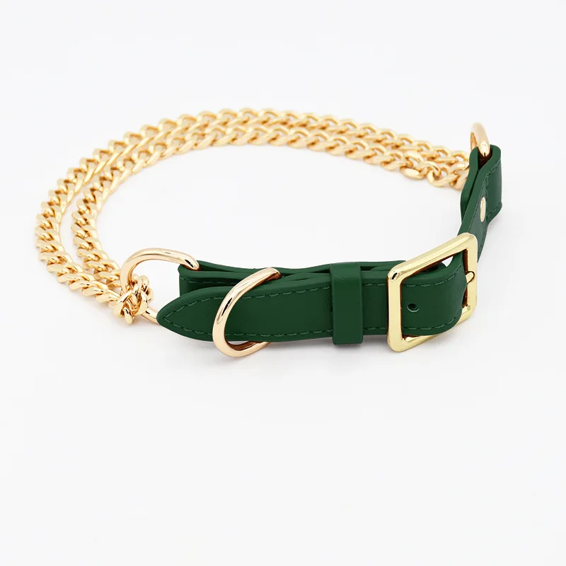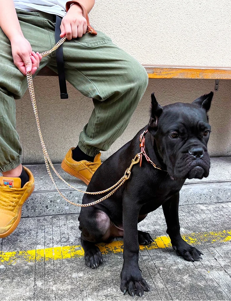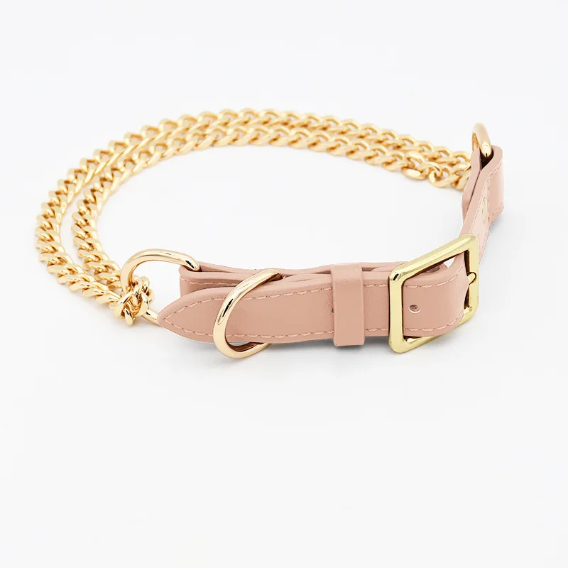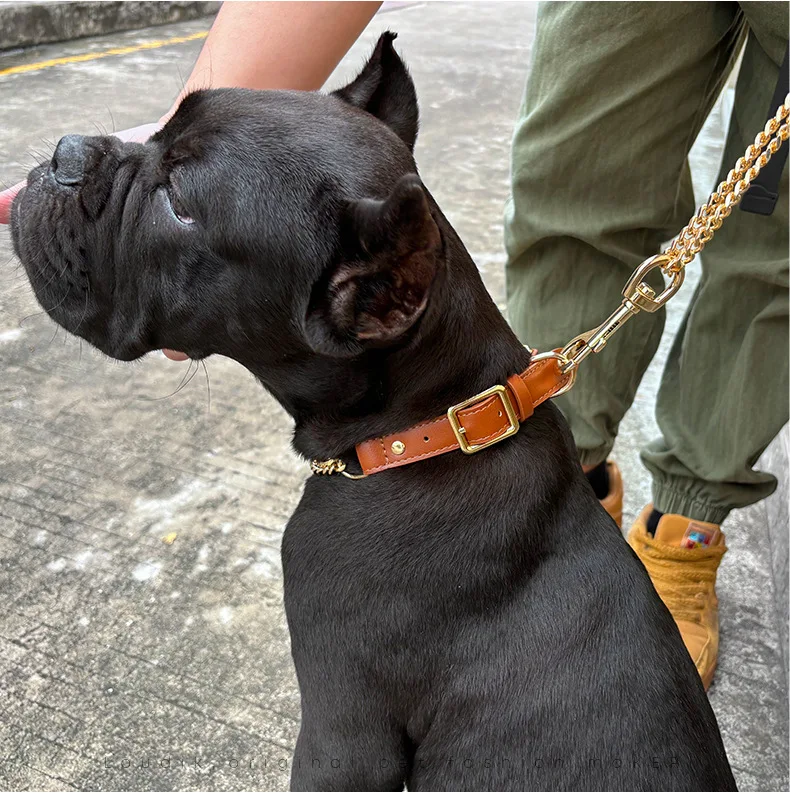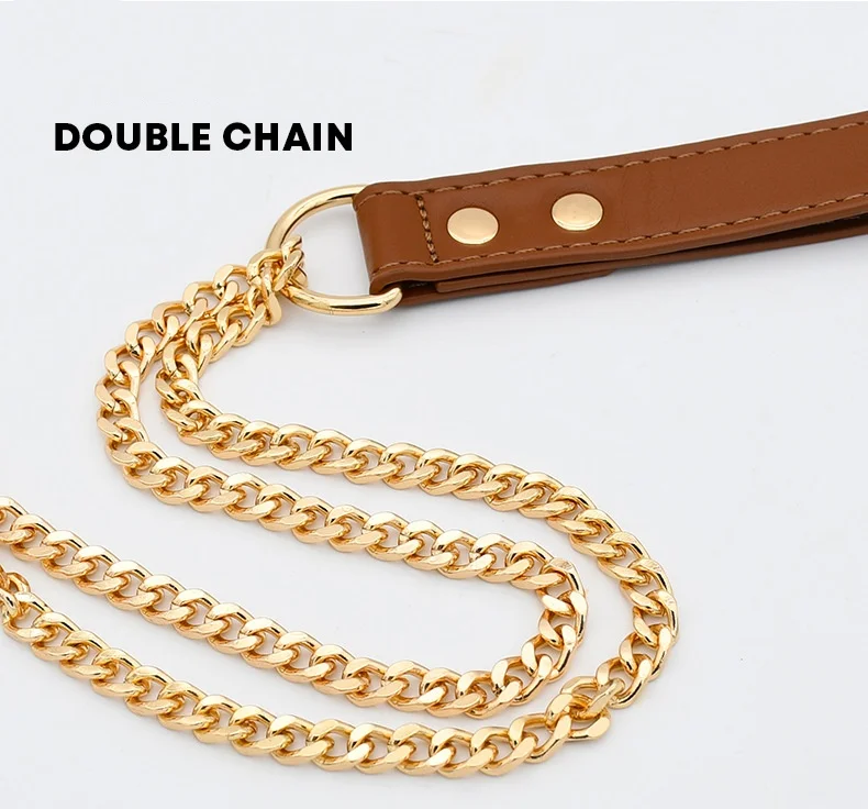 Correa de cadena dorada para perro con mango de cuero, cadena de acero inoxidable, Collar antiescape para perro P, juego de collar de correa de cadena doble de metal