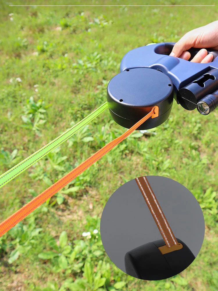 El confiable botón de freno y bloqueo garantiza la capacidad de ajustar la longitud de la correa según sea necesario. Presione el botón hacia abajo para bloquear la correa y haga clic en el botón hacia atrás para enrollar fácilmente su perro.
