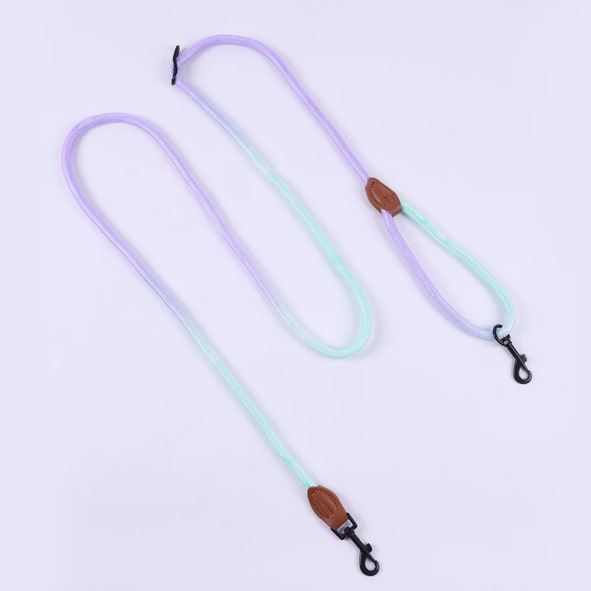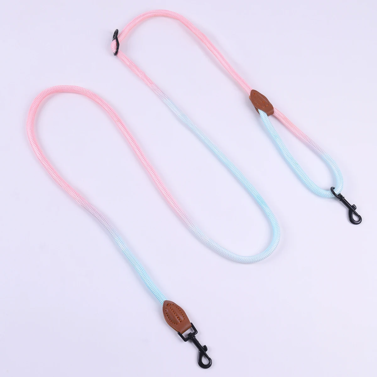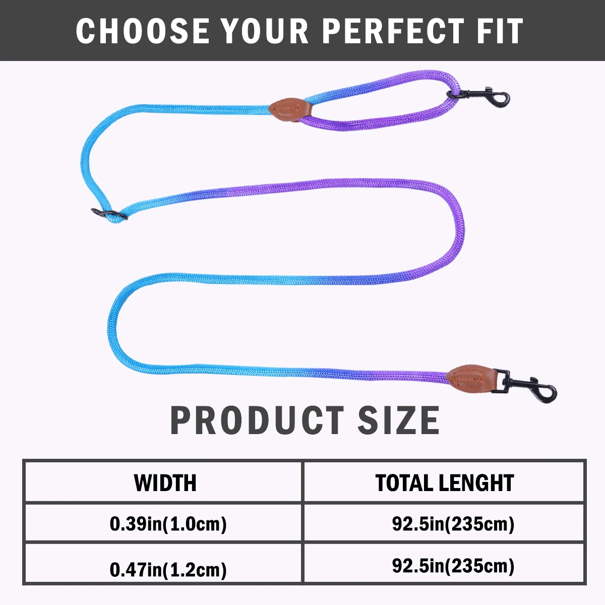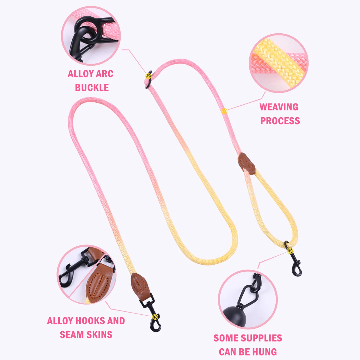 Estructura duradera: hecha de cuerda gruesa de nailon, duradera; El material de nailon es ligero y flexible, pero lo suficientemente fuerte como para soportar a su cachorro; el cinturón tiene una hebilla de metal duradera que gira 360 grados y se puede enganchar fácilmente en el cuello y la correa del pecho;