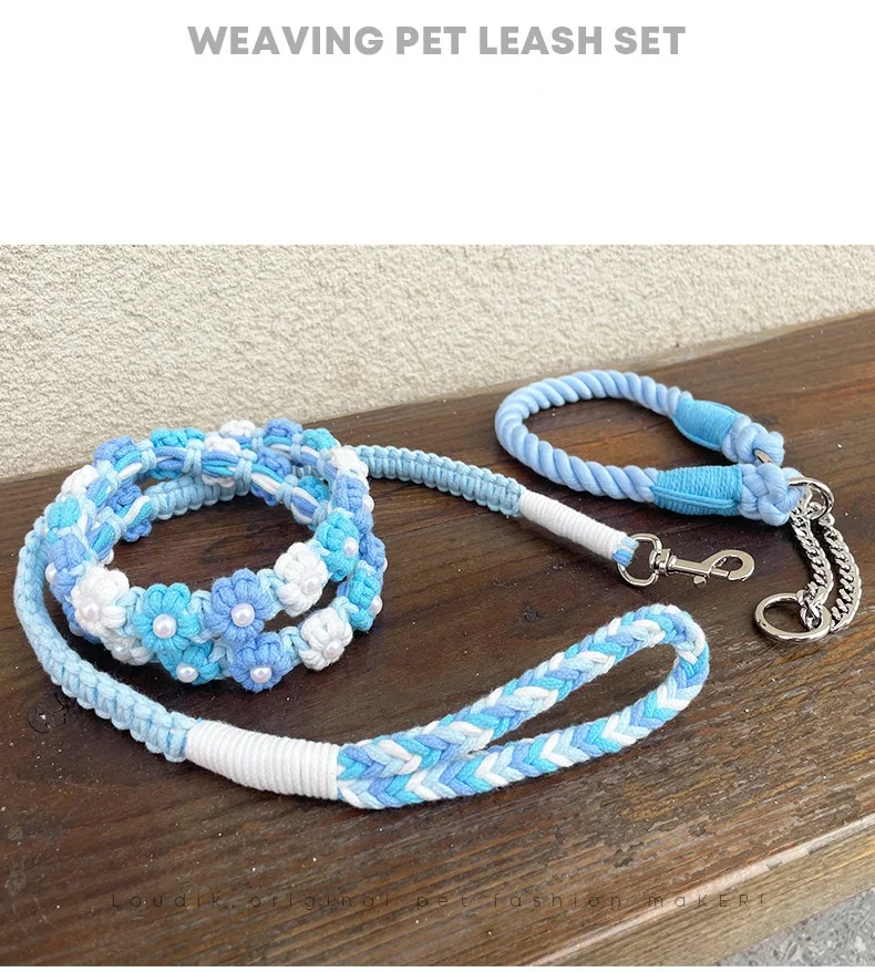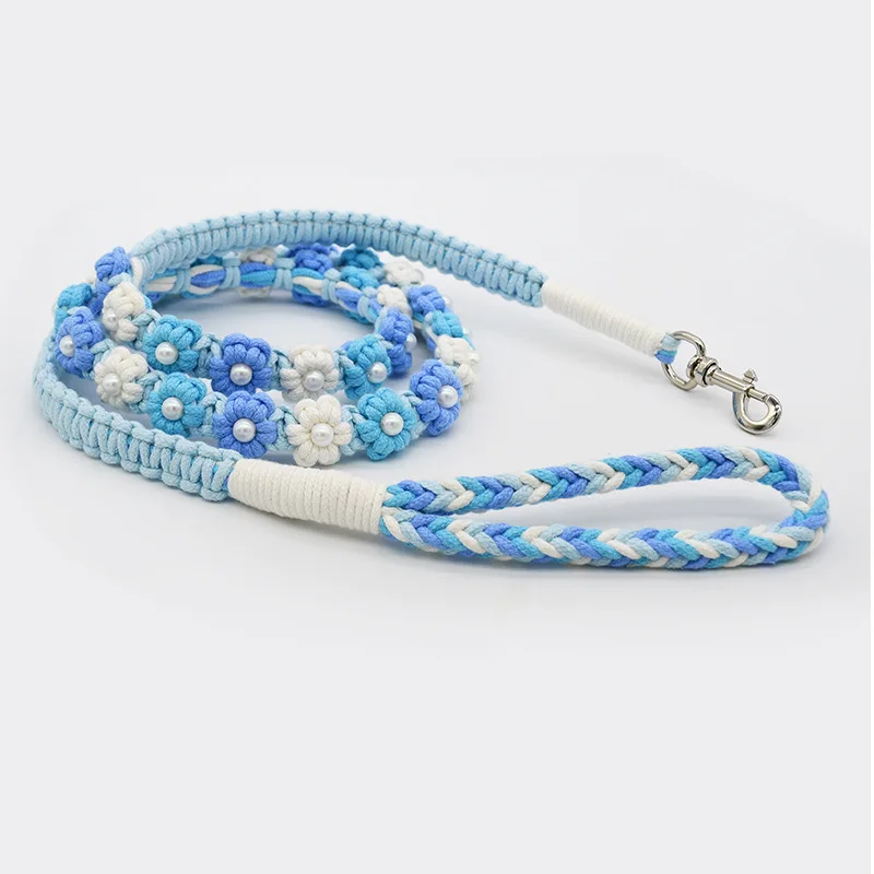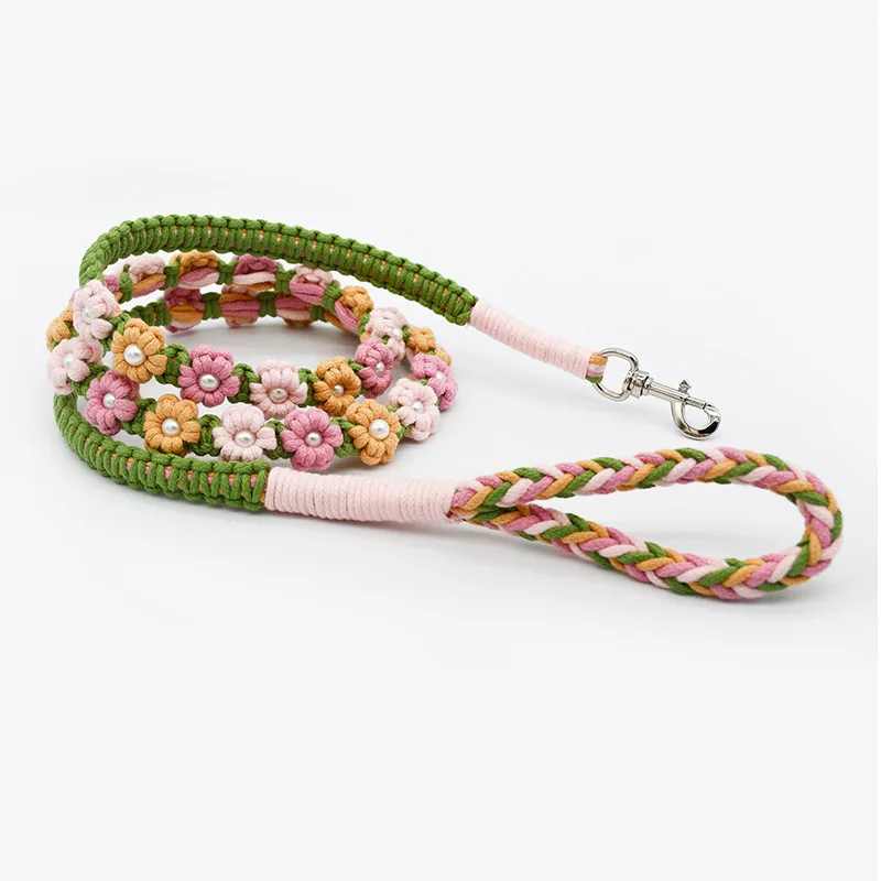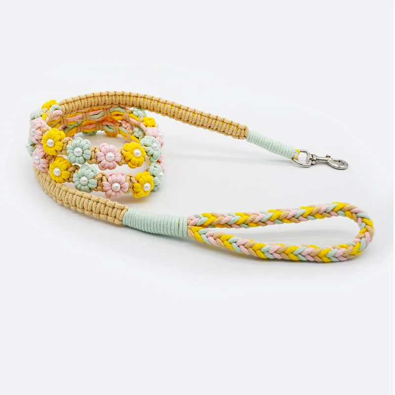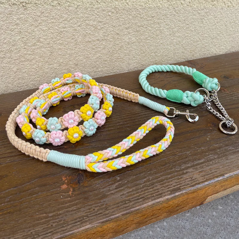Correa de perro de algodón trenzada hecha a mano con mango floral Collar tejido duradero y elegante para perros Correa para mascotas de color arcoíris con collar