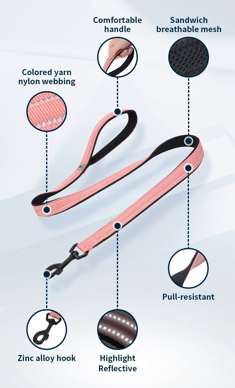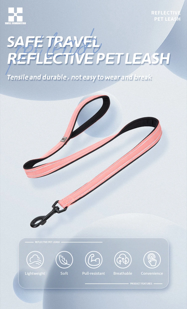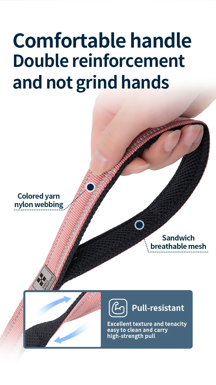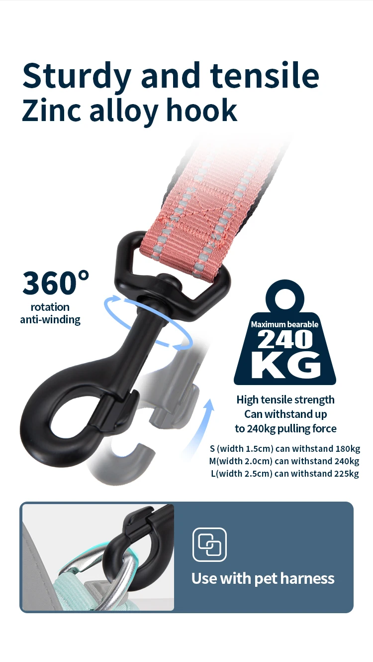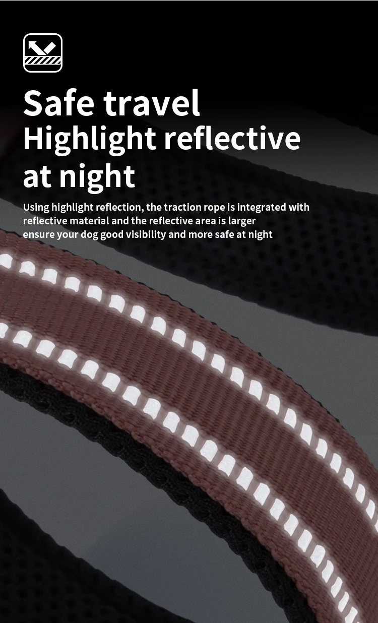 3. Viaje seguro Resalte el reflejo por la noche Usando el reflejo de resaltado, la cuerda de tracción está integrada con material reflectante y el área reflectante es más grande garantiza que su perro tenga buena visibilidad y sea más seguro por la noche.