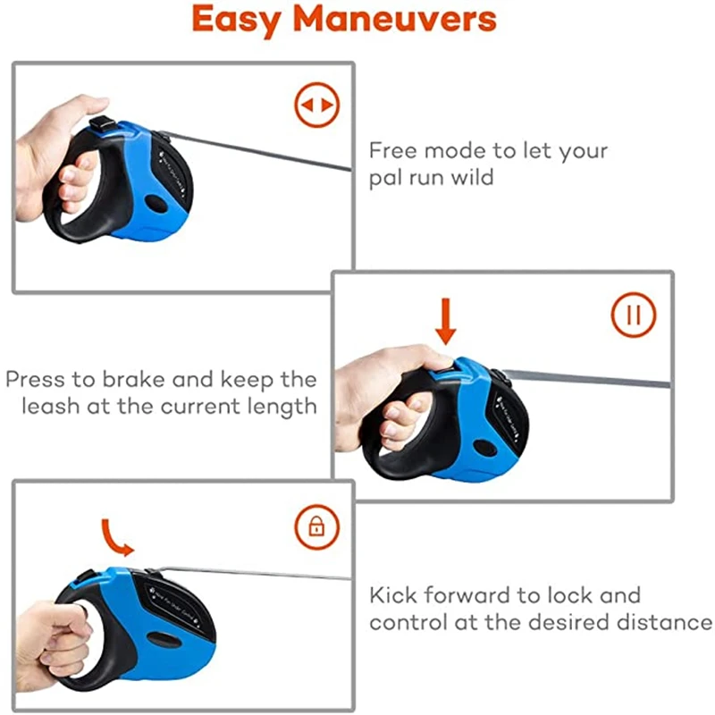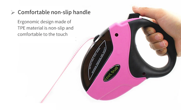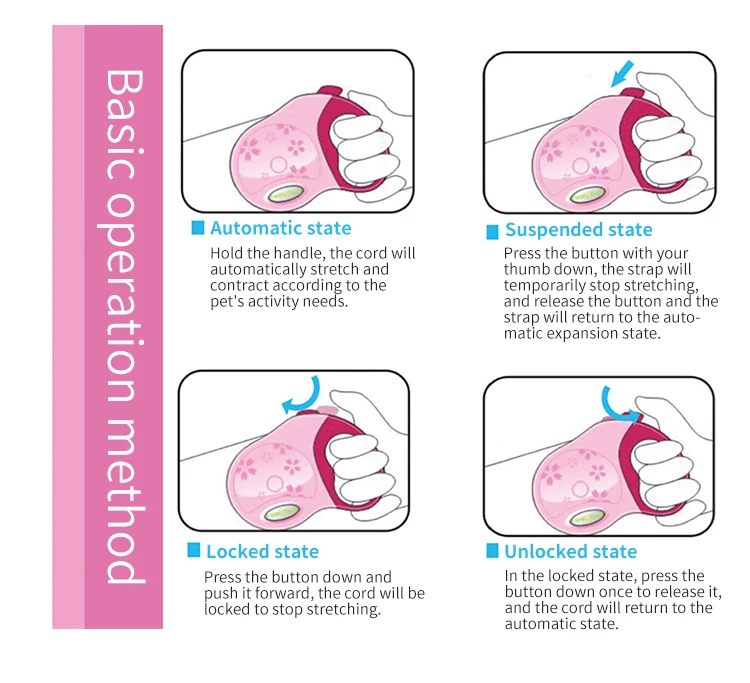 Sujete el mango, el cordón Se estirará y contraerá automáticamente según las necesidades de actividad de la mascota.