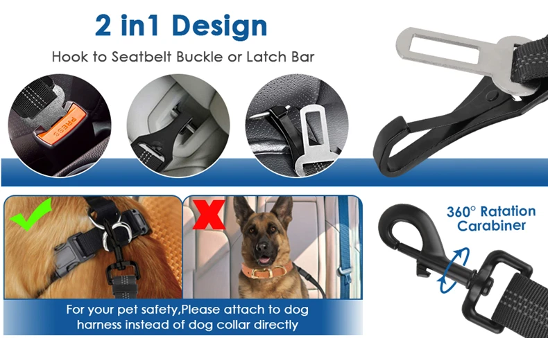 1. La nueva versión mejorada es de diseño 2 en 1, que ofrece 2 formas alternativas de sujetar la correa del perro, enganchando a las barras de enganche o utilizando el mismo método de uso que los cinturones de seguridad del automóvil.