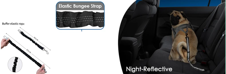3. Con la correa y la hebilla en la cuerda elástica en el interior, este cinturón de seguridad se puede ajustar de 16,5 pulgadas a 26 pulgadas y se puede estirar a 30,71 pulgadas para la longitud máxima. Buena longitud ajustable para que los perros puedan sentirse cómodos sin restringirse.