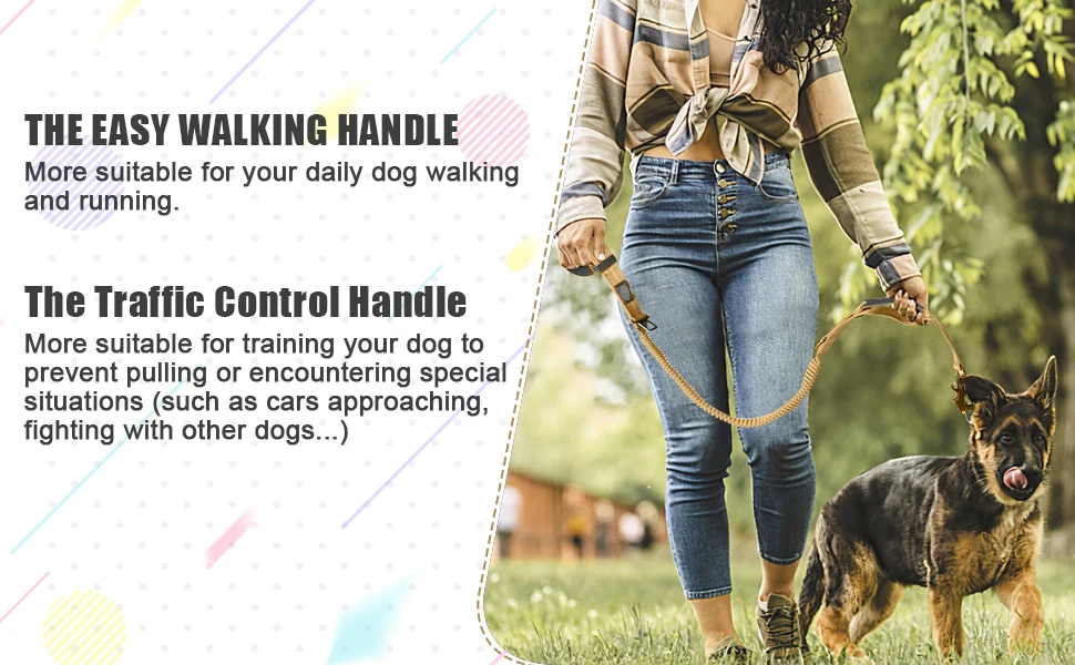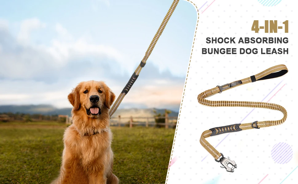 Tactical Dog Leash Heavy Duty 4-6FT Shock Absorbing Bungee Dog Leash with 2 Padded Handle, Metal Carabiner Clip,Car Seatbelt,Strong No Pull Dog Leash for Medium Large X-Large Dogs QUICK RELEASE FROG CLIP :The dog leashes for large dogs heavy duty is fitted with a super durable Frog Clip which is made of aviation aluminum alloy. Quick release and locking dog leash buckle while holding tight under strong pull. 360°rotatable to prevent the dog leash from twisting and knotting COMFORT DOUBLE HANDLES:Our tactical dog leash is designed with 2 different comfortable handles. The Padded handle at the end is more suitable for your daily dog walking. The soft rubber traffic handle is more suitable for used on busy sidewalks, bike lanes, and crowded areas in order to close control of your dog SHOCK ABSORBING BUNGEE LEASH:This bungee dog leash for medium dogs uses innovative Zero Shock BUNGEE Technology,can be stretched to a maximum length of 6ft.Improve control and cushion, eases the pressure for both the owner and the dog,makes dogs' walking enjoyable