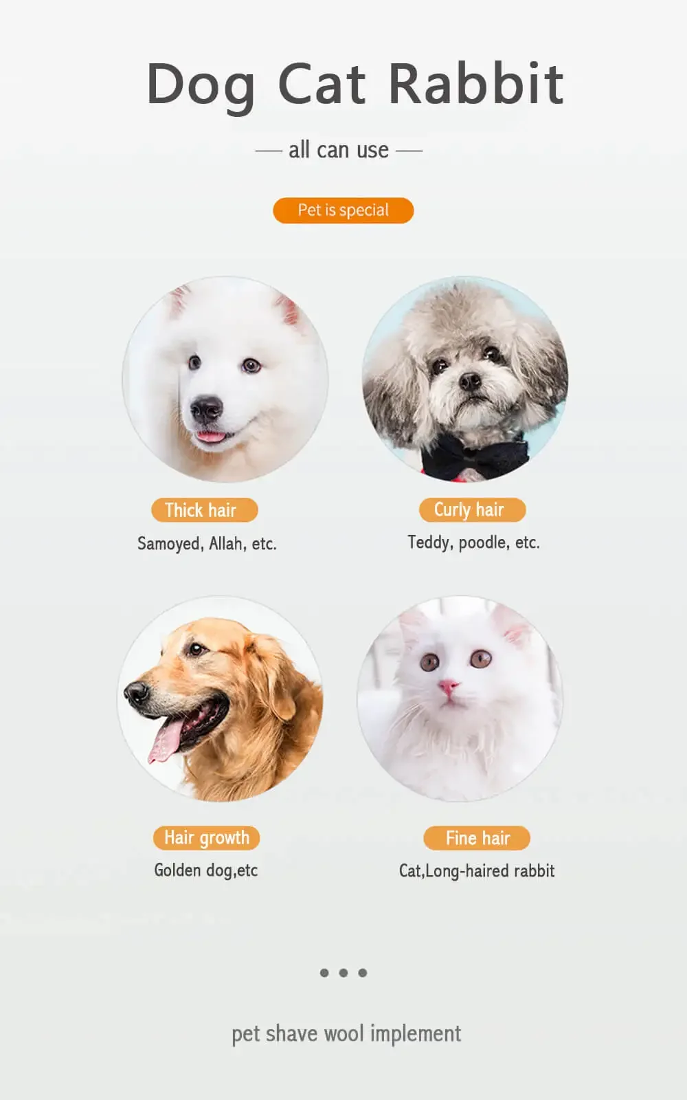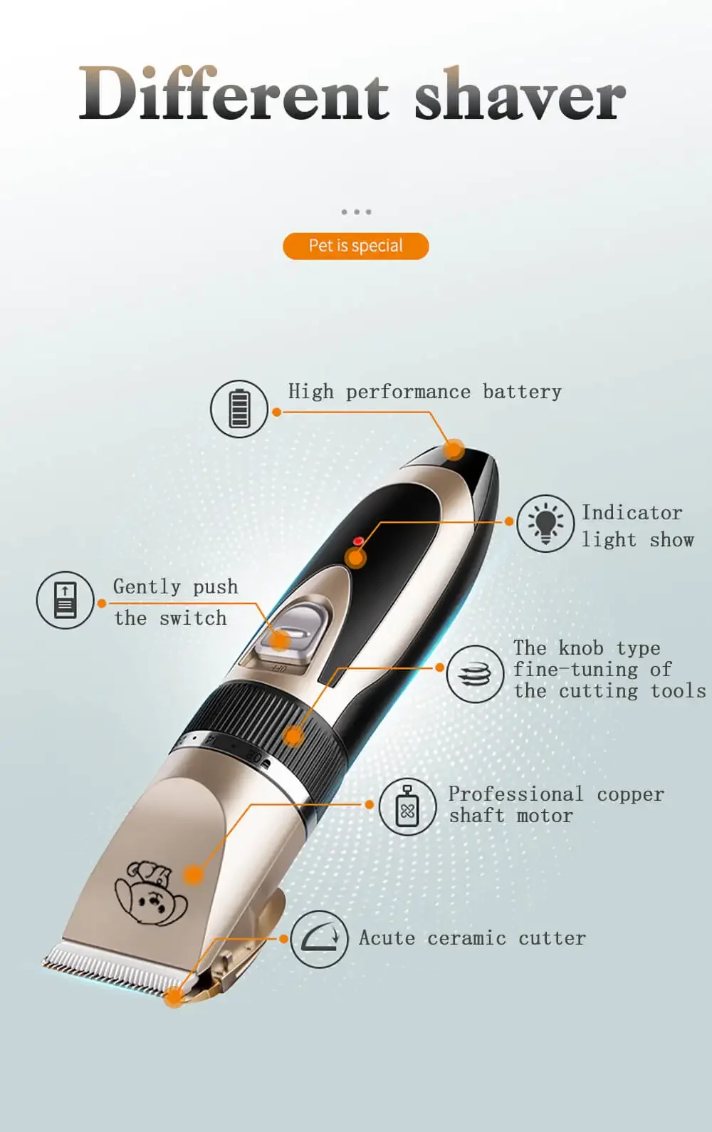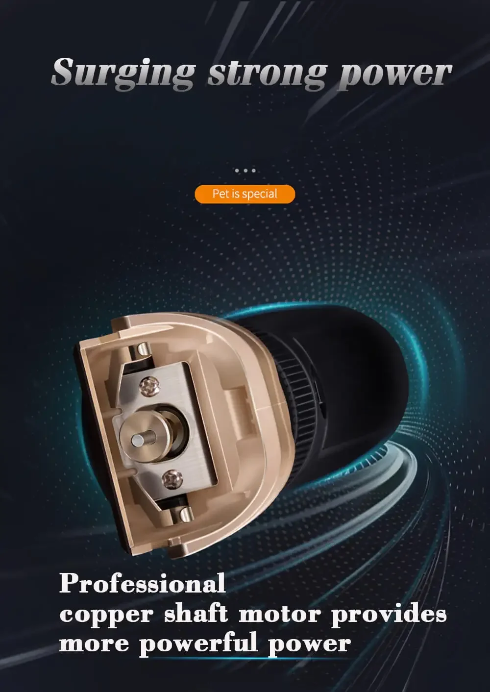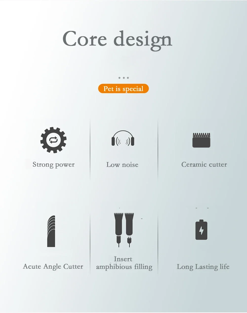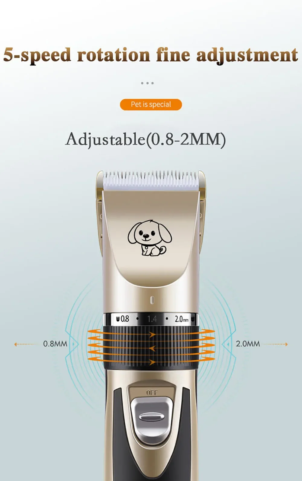 -Motor profesional y potente (el eje está hecho de cobre fino), recorta fácilmente el pelo de las mascotas sin atascarse, no daña la piel de perros o gatos, no se oxida y es duradero. -Motor de precisión, baja vibración y diseño ultra silencioso, aproximadamente 60 dB, como si estuviera escuchando una caja de música. -Los motores de baja vibración y bajo ruido los hacen más relajados y reducen su miedo al ruido. -El ajuste fino de 5 velocidades de la cuchilla facilita el afeitado del pelo corto de las mascotas. -El diseño ligero e inalámbrico lo hace más simple y fácil de usar. -Carga durante cinco horas, puede durar 60 minutos-Los peines de corte ajustables son adecuados para cortar cabello de varias longitudes; los peines guía extraíbles hacen que el cambio de peines sea fácil y rápido, y aumenta la versatilidad. -Diseño aerodinámico de cuerpo antideslizante de acuerdo con la ergonomía. -La luz LED indica el estado de funcionamiento y tiene protección contra sobrecargas para mejorar la seguridad de uso. -El peine de corte ajustable es adecuado para recortar cabello de varias longitudes; el peine guía móvil hace que sea fácil y rápido cambiar el peine, aumentando su versatilidad.