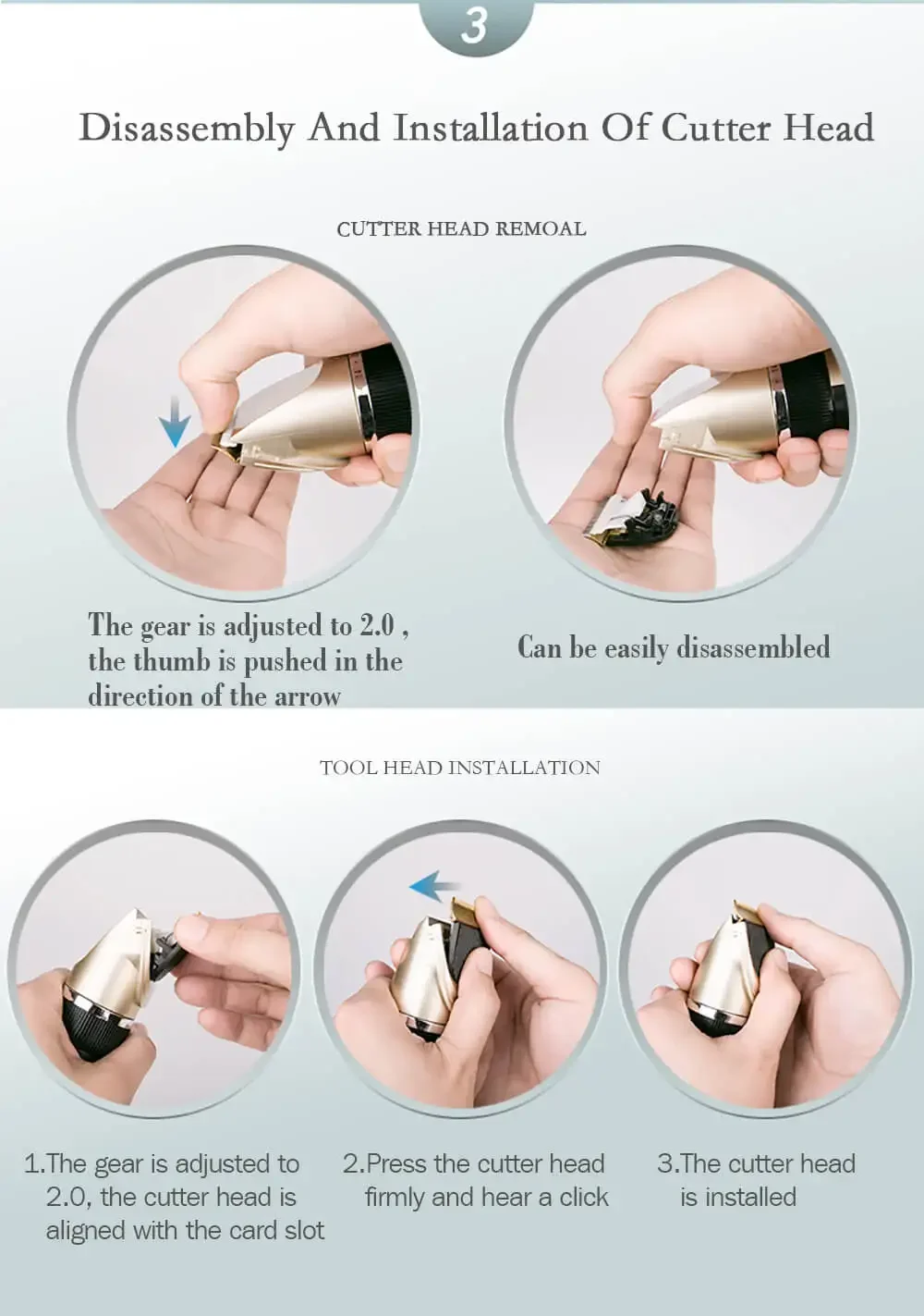 Nombre del producto: cortadora de pelo para mascotas Material: plástico Color: dorado Material de centrado: latón antidesgaste Dimensiones del cortaúñas: 175x42mm (largo x ancho) Voltaje de funcionamiento: 3,7 V Tiempo de carga: alrededor de 3 horas Tiempo de funcionamiento: 120 minutos del adaptador Salida: CA 3V 1000mA Entrada del adaptador: 110V-240V 50 / 60Hz Peine: 3mm a 6mm 9mm 12mm Peine