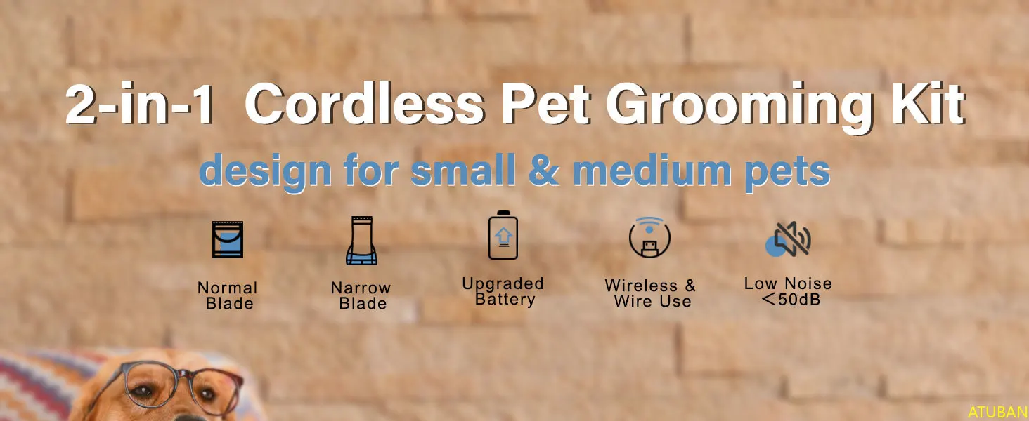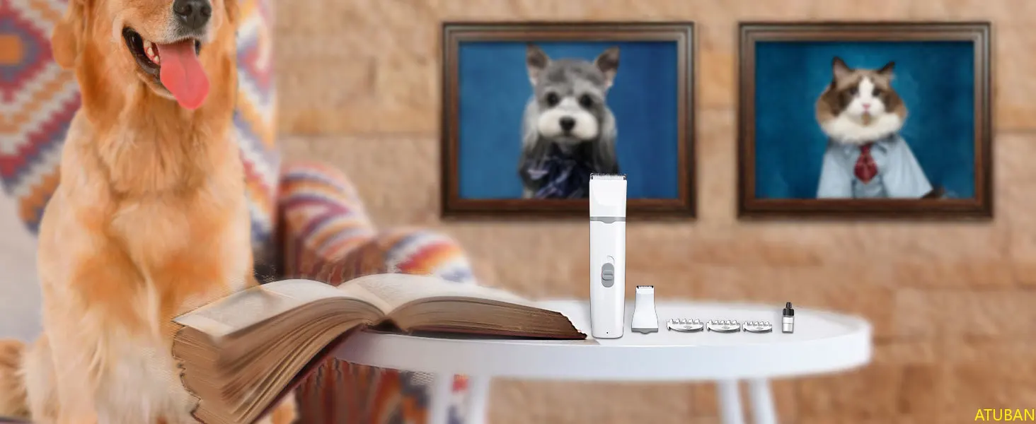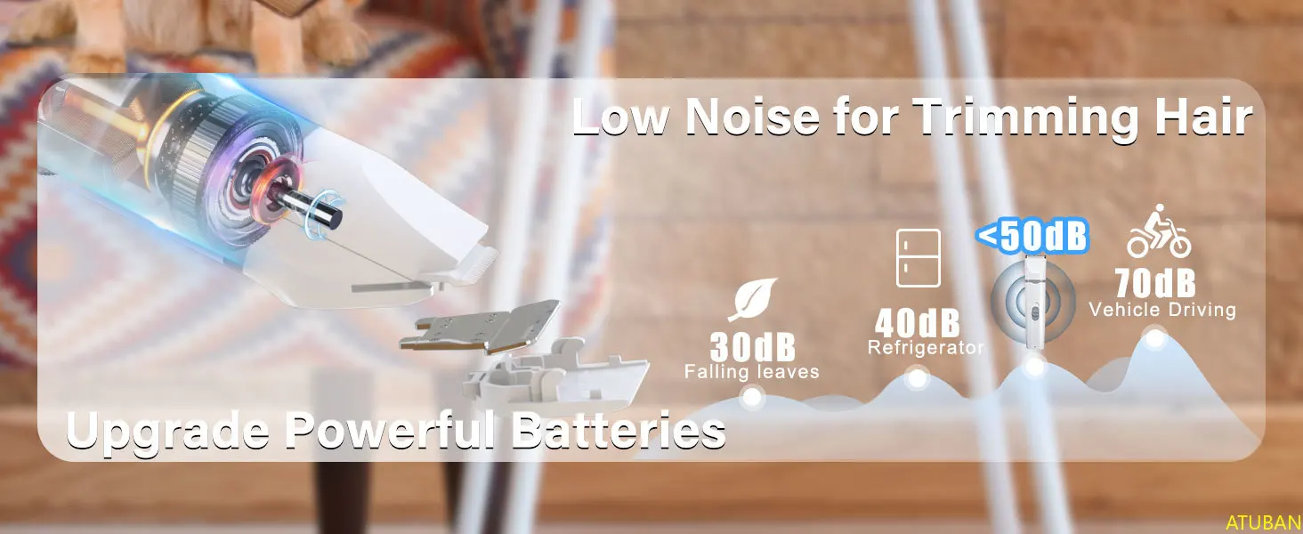 El sonido de vibración producido por El recortador de pelo para mascotas ATUBAN durante el uso es 50dB. Las mascotas pueden aceptar este nivel de sonido, y puede iniciar el producto y pasárselo a su encantadora mascota para que se familiarice con este producto