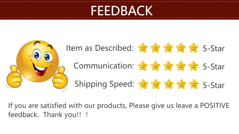 Ofrecemos un servicio de calidad y garantía de calidad. Si está satisfecho con nuestros productos y servicios, espero que nos dé comentarios positivos y deje un elogio de 5 estrellas. Si tiene alguna insatisfacción, póngase en contacto con nosotros antes de solicitar una disputa, y nos comprometemos a resolverla por usted.