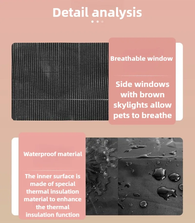 Tela Oxford portátil impermeable para mascotas cubierta Ventana transpirable. Material impermeable, se utiliza material especial de aislamiento térmico en la superficie interior para mejorar la función de aislamiento térmico. Hilo de coser apretado, costuras firmes, cuerda de nailon gruesa en la parte superior, seguro de usar. Material duradero y engrosado. Nota: Debido a los diferentes métodos de medición, puede haber errores de 1-2 CM y los parámetros específicos están sujetos al producto real.