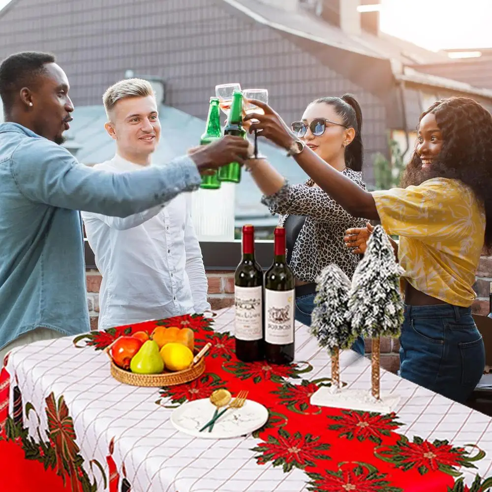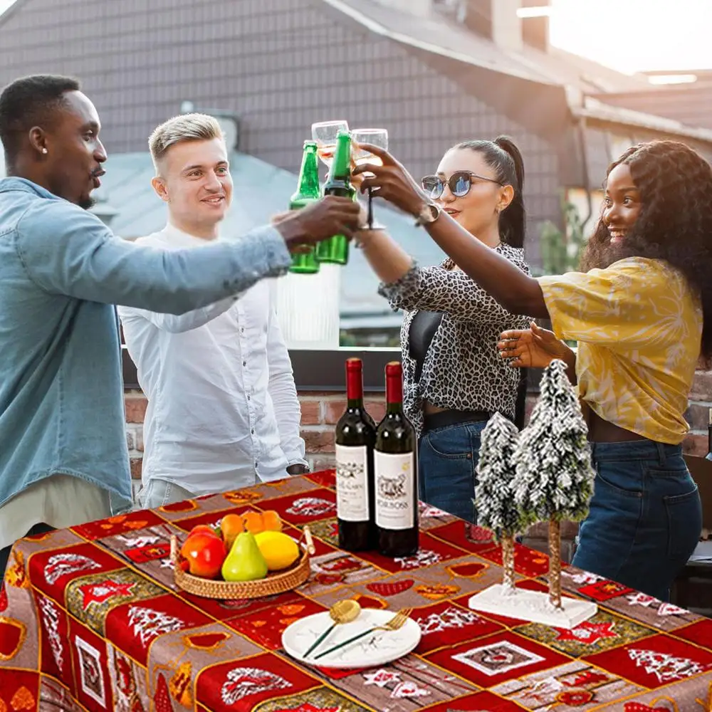 4. Ampliamente aplicable: mejora cualquier reunión con nuestro mantel navideño.Diseñado para eventos de catering, banquetes y cenas familiares, protege la mesa de su cocina de las manchas y agrega un toque festivo a su decoración.Perfecto tanto para uso interior como exterior.