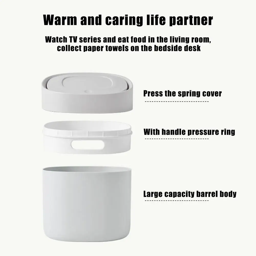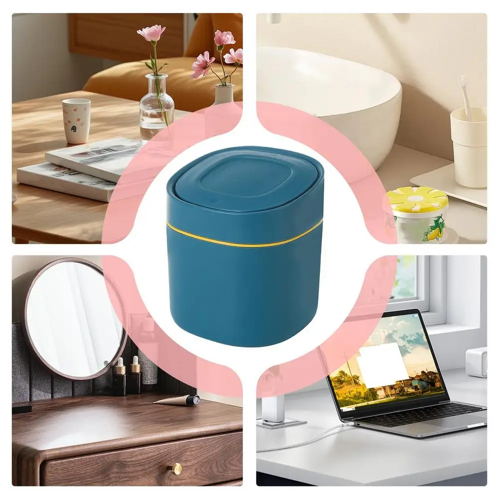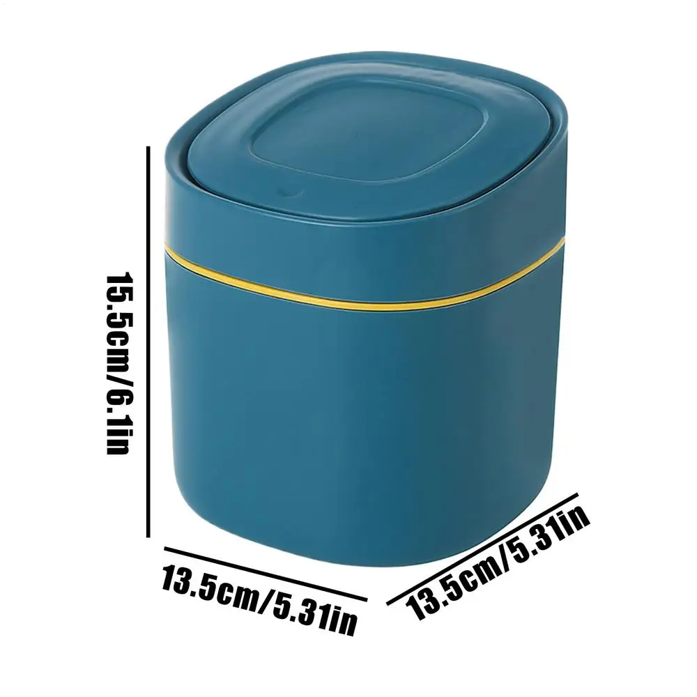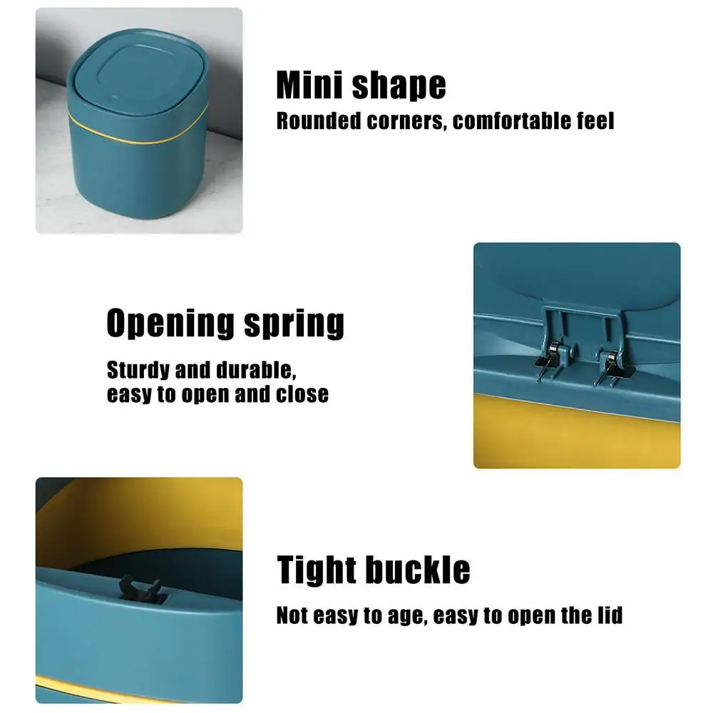 1. Uso seguro de la tapa: con un sistema de botón inteligente, este bote de basura de escritorio ofrece un cierre seguro y un uso fácil, mejorando la experiencia del usuario y manteniendo el entorno limpio y fácil.