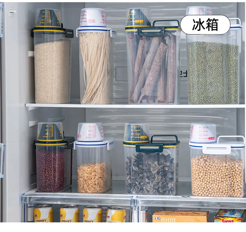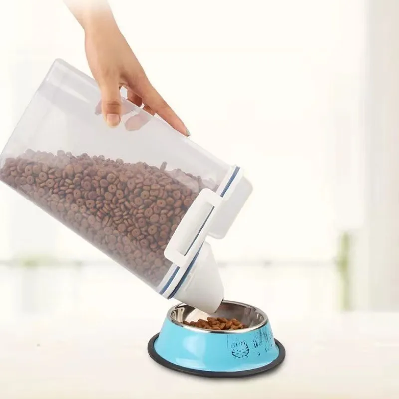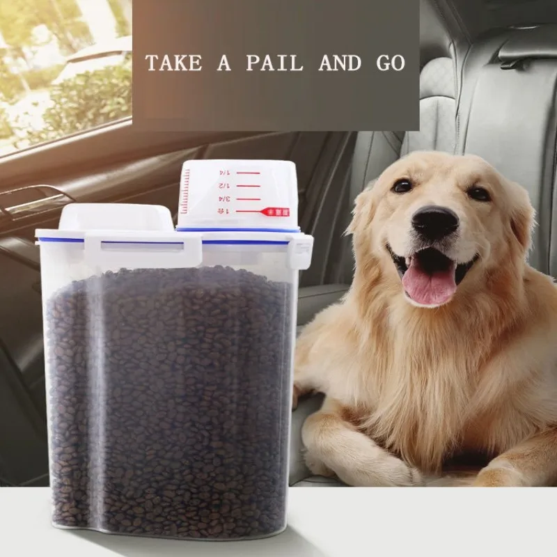 Cubo de comida para perros y gatos, recipiente de plástico con taza medidora, tarro sellado a prueba de humedad, accesorios para mascotas, caja de almacenamiento de cocina