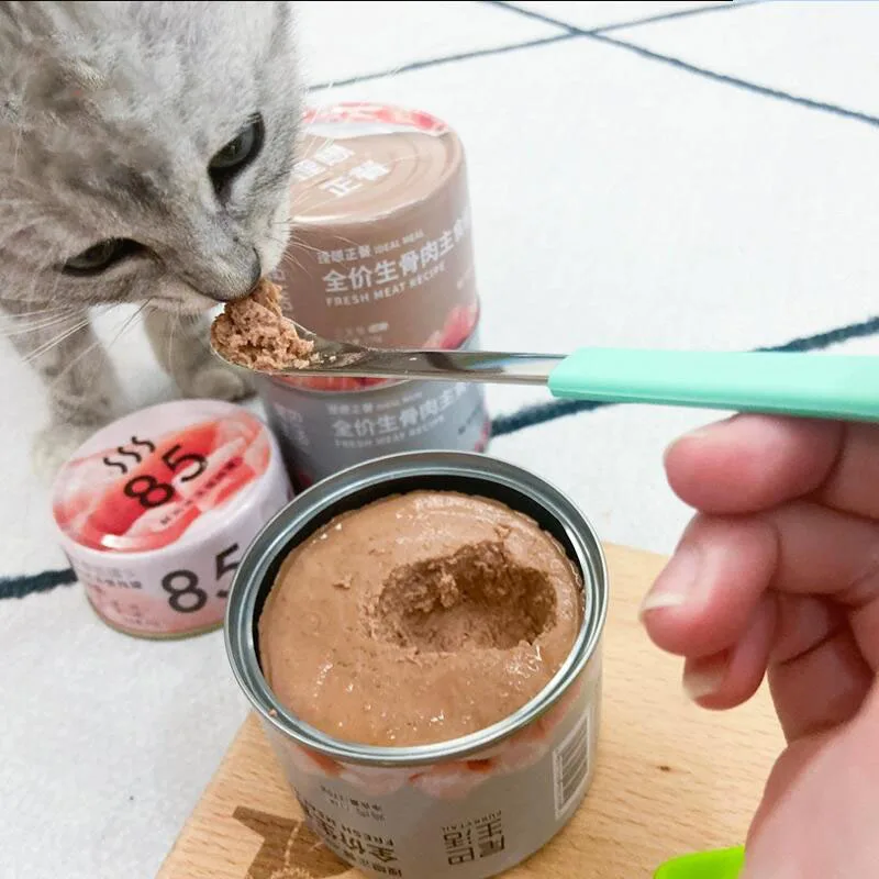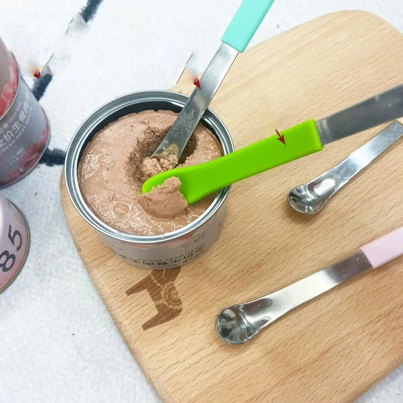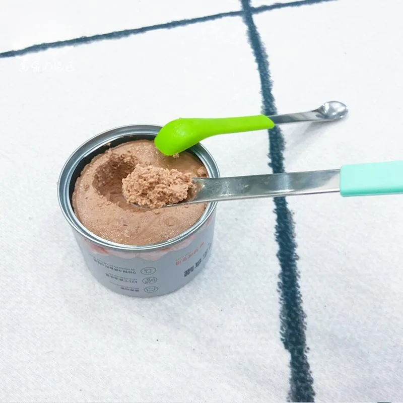 Cuchara para conservas de acero inoxidable, doble cabeza, suave, duro, gato, perro, comida húmeda, vajilla, pudín, aperitivo, mango largo, mezcla de mascotas