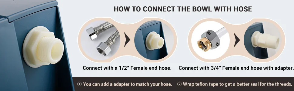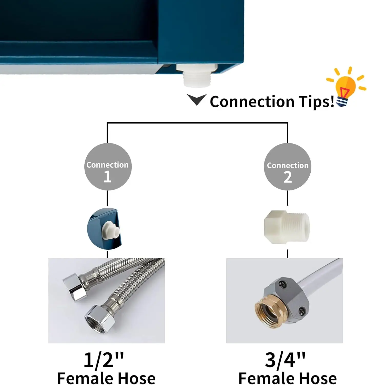 Consejos de conexión: Puede conectar el recipiente con una manguera de extremo hembra de 1/2" que no está incluida en el paquete; o conéctelo con una manguera de extremo hembra de 3/4" con adaptador.No olvide envolver la cinta de teflón al conectarla.