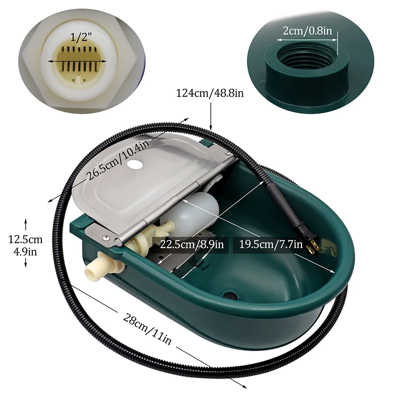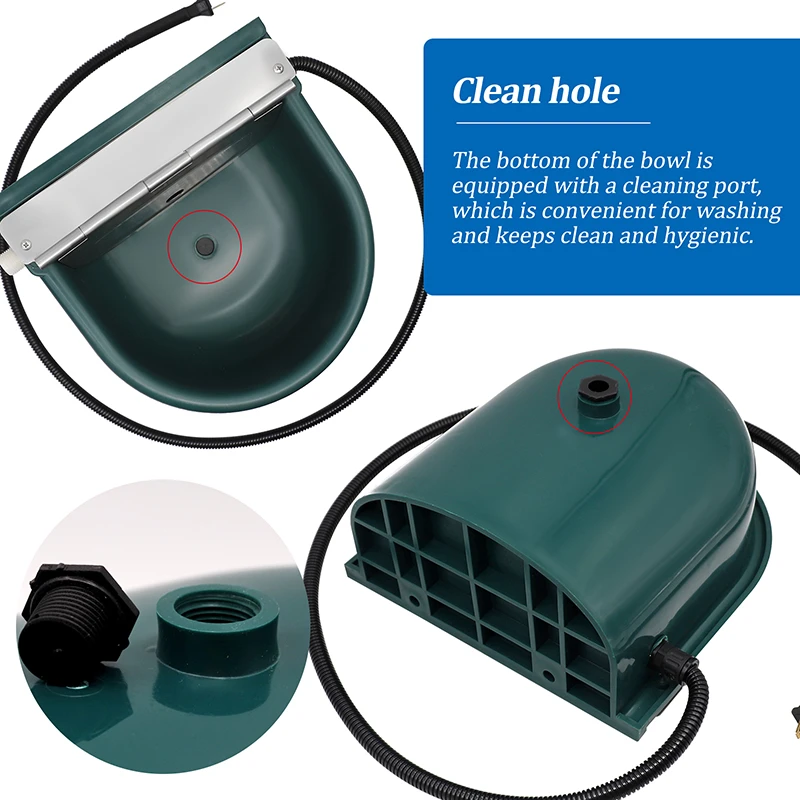 3. El cuenco de agua automático puede conectarse fácilmente a una tubería de 1/2 pulgadas, manguera flexible o manguera de jardín. Con orificio de drenaje en la parte inferior, que puede descargar aguas residuales, lo que es más conveniente.