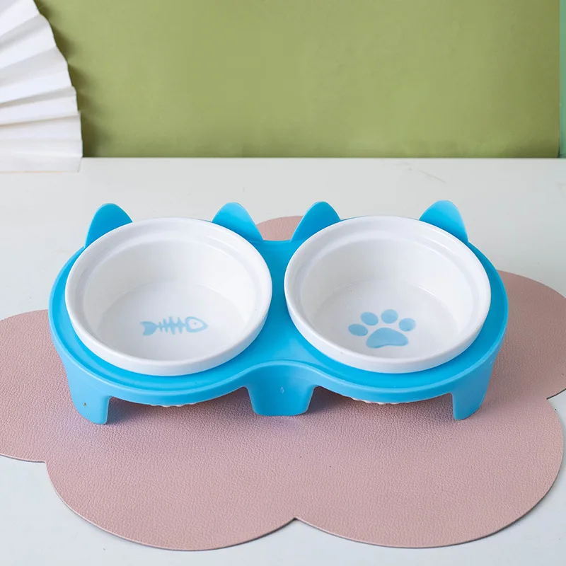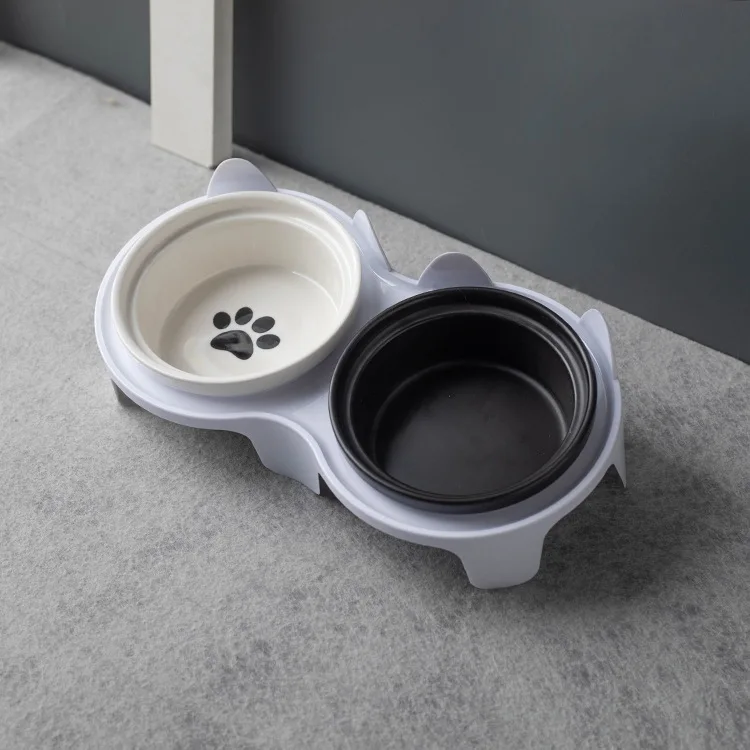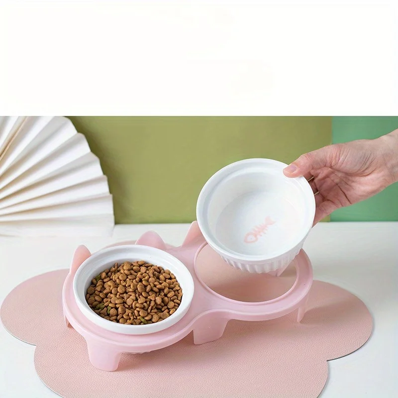 Cuenco de alimentación de cerámica para mascotas, cuenco doble, ángulo inclinado para sujetar comida y agua, protege la columna cervical del gato.