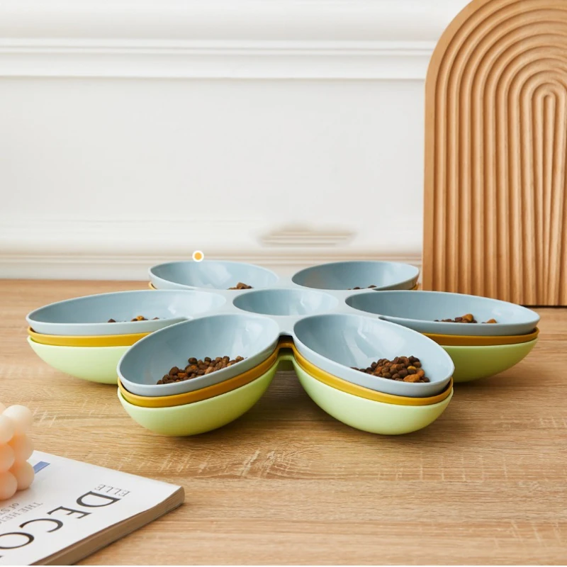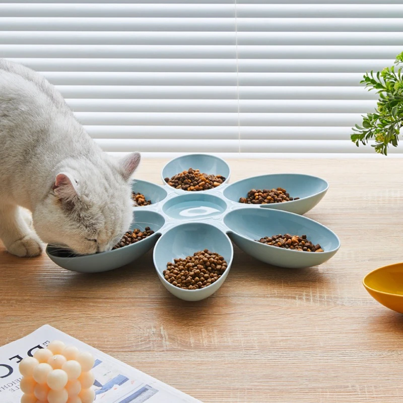 Recipiente de alimentación para mascotas de 6 pétalos: plato para gatos/perros múltiples con diseño antisobstrucción, bandeja de plástico PP para comida y agua fácil de limpiar para gatitos/caporros, ahorro de espacio para hogares con múltiples mascotas (rosa, verde, azul)