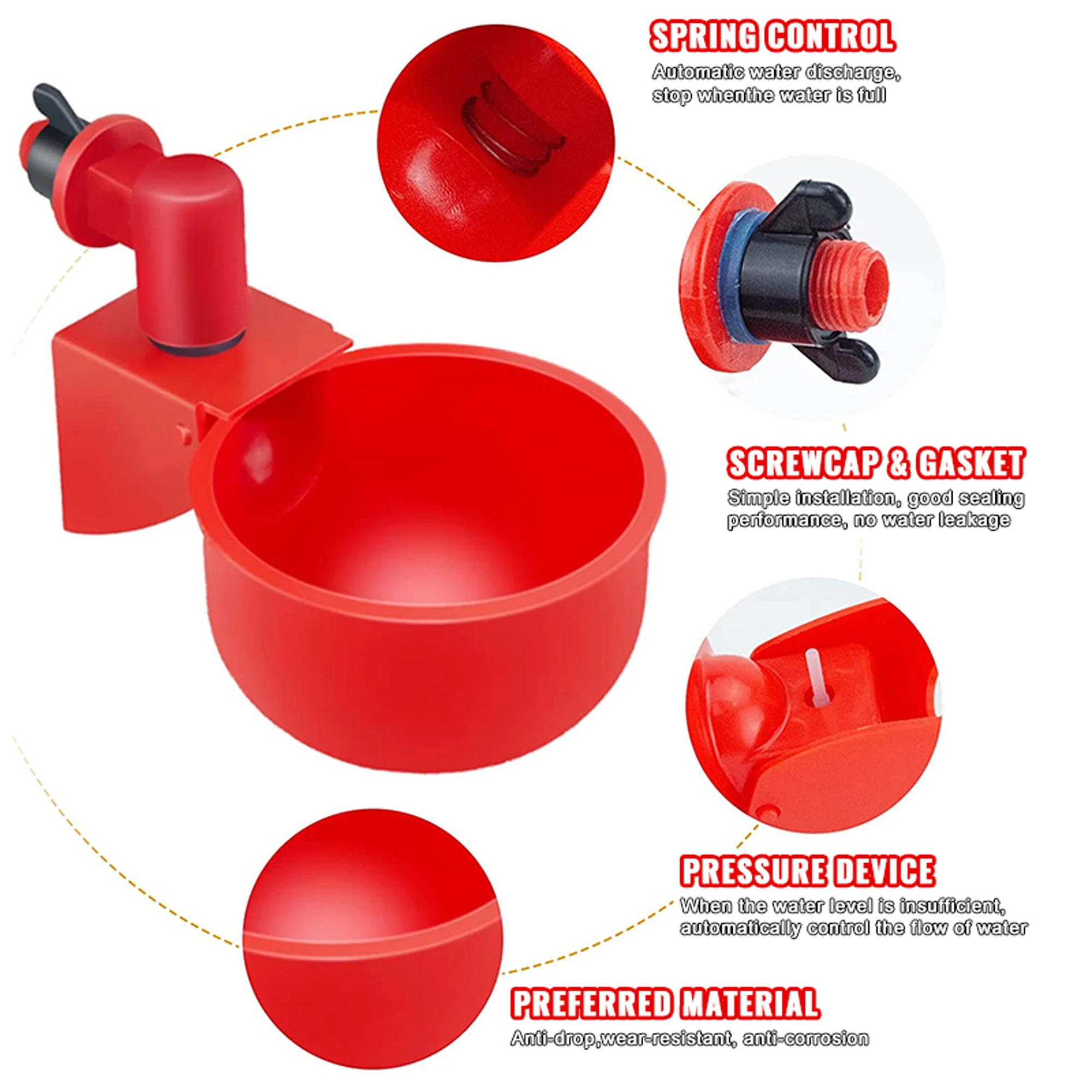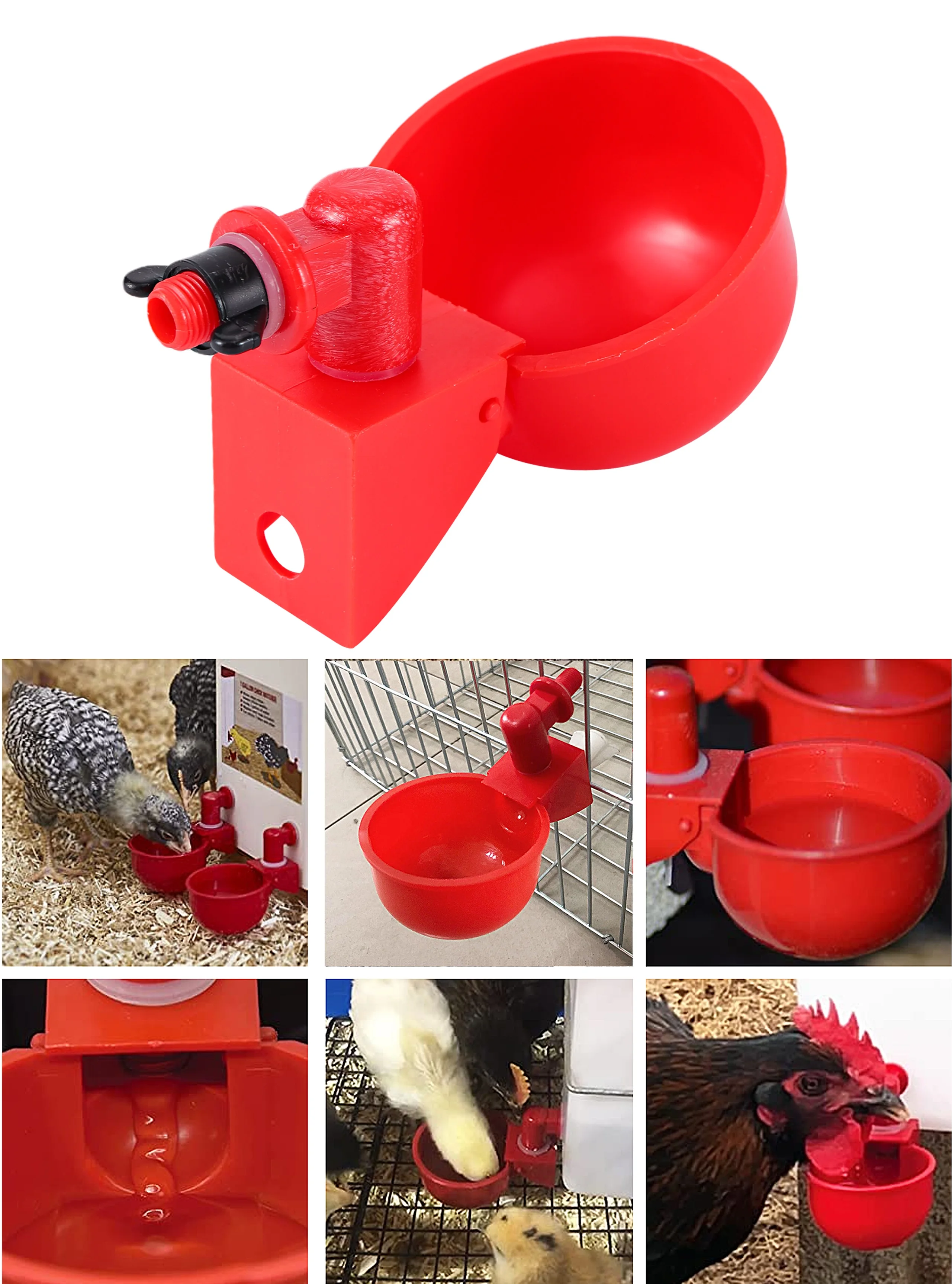 Descripción del producto: Fácil de usar, seguro y muy conveniente. El mejor diseño es alimentar al pollo, al pájaro de codorniz de paloma, etc. Adecuado para uso en granjas de pollos domésticas y comerciales. Gontanan agua de la taza y permitieron que la cantidad adecuada de agua entre en la taza. Nombre: Taza de agua automática para pollo Material: plástico Color rojo Tamaño del eslabón de rosca: 9 mm Objetos aplicables: pollo, codorniz, paloma, loro, pájaro, etc. El paquete incluye: 5 uds x taza de agua automática para pollo 5 uds x tornillos de fijación de cubo 5 juegos x tornillos de fijación para jaula de aves de corral (regalo, blanco/negro al azar) Consejos del vendedor: Permita errores de 0-1 mm debido a la medición manual. El color del artículo que se muestra en las fotos puede verse ligeramente diferente en el monitor de su computadora, ya que los monitores no están calibrados del mismo modo.