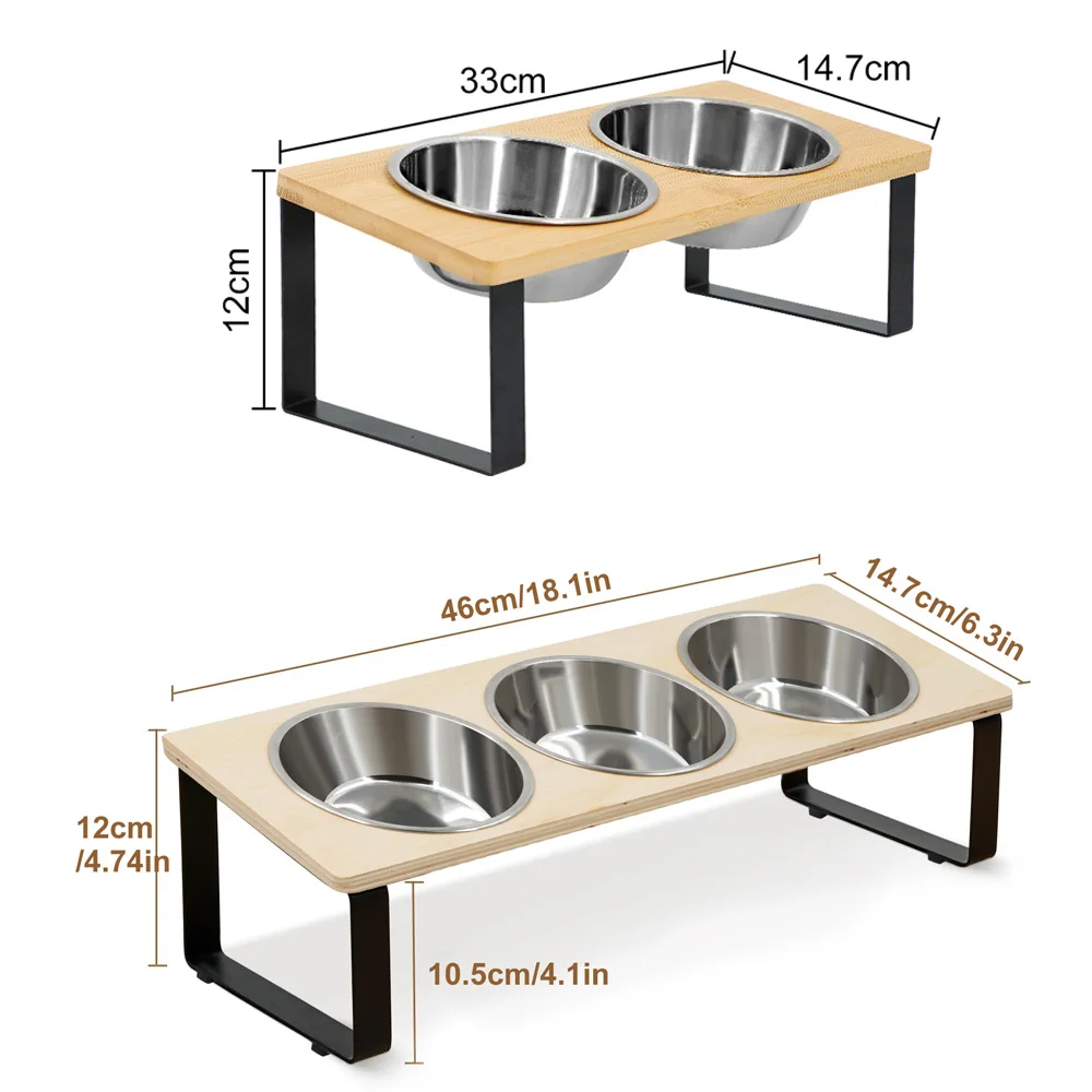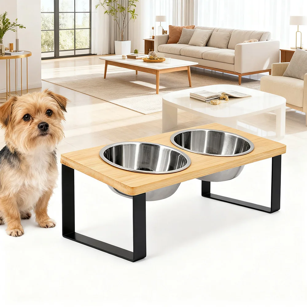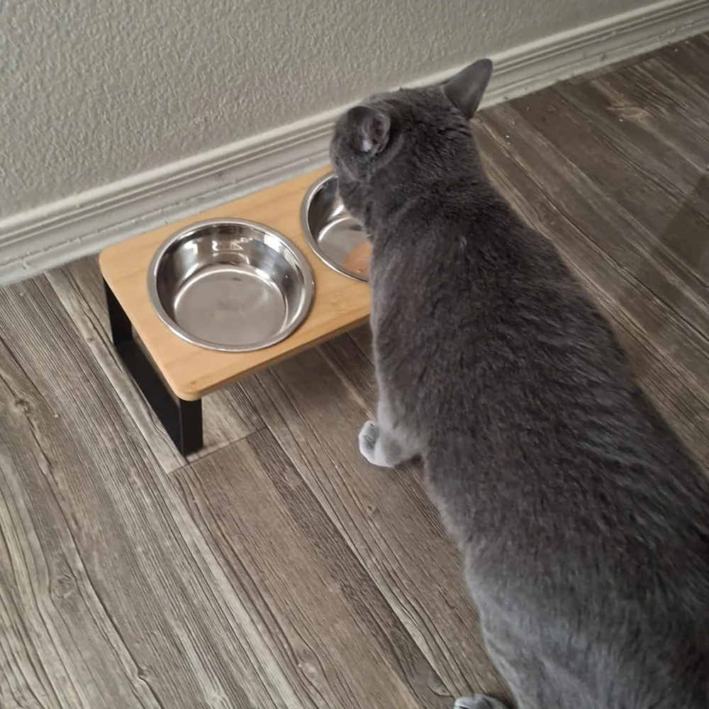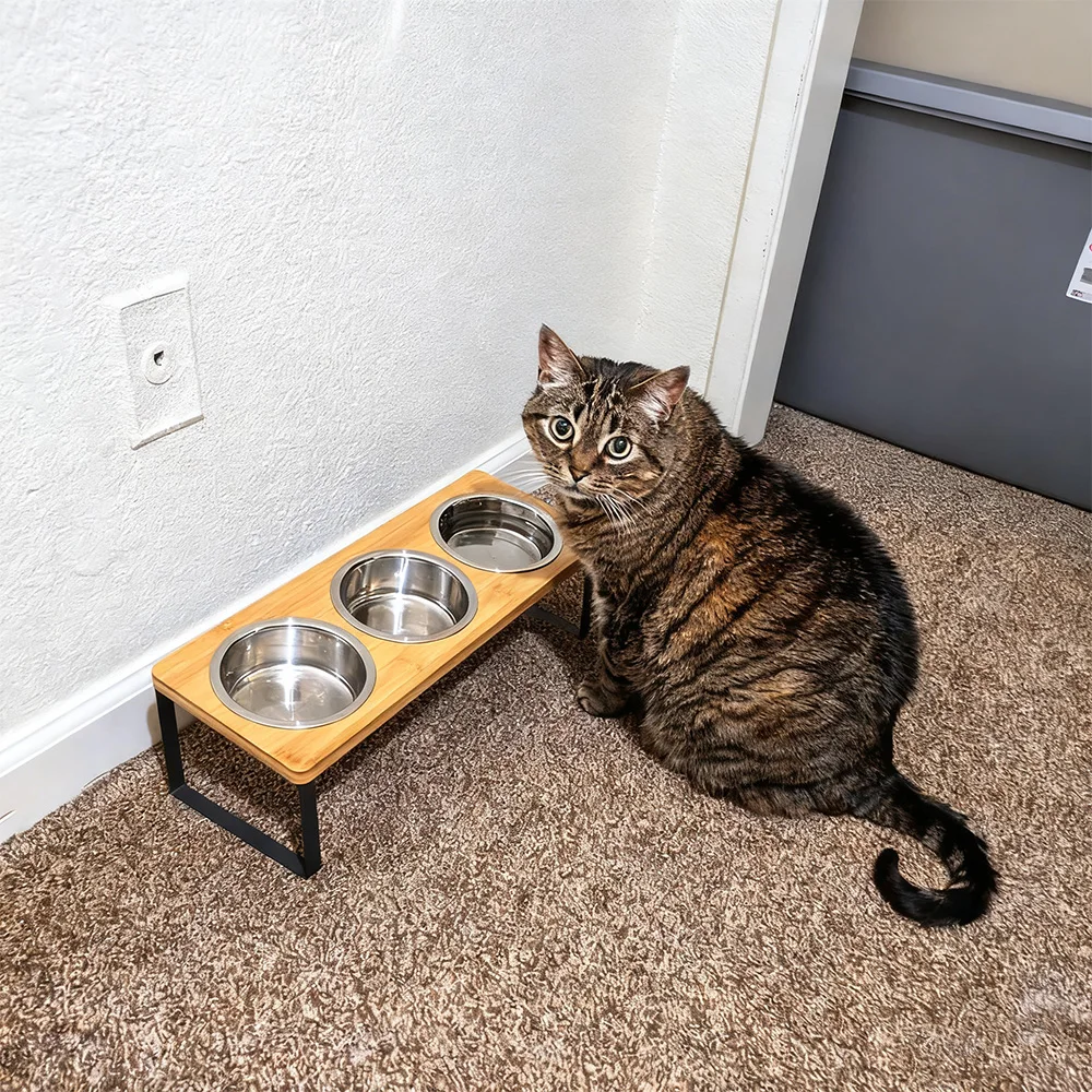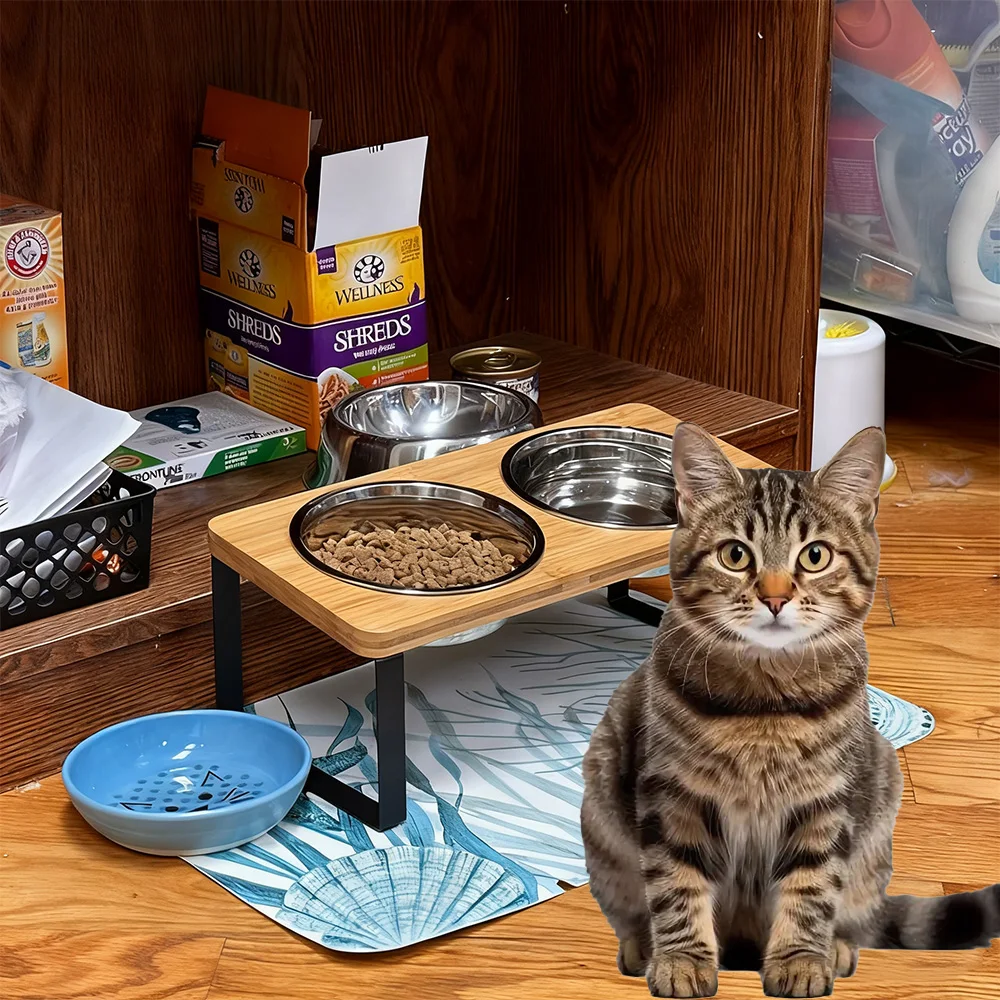Cuenco elevado para gatos doble, comedero elevado de bambú y metal con platos de acero inoxidable, solución de comedor para mascotas para gatos y perros pequeños