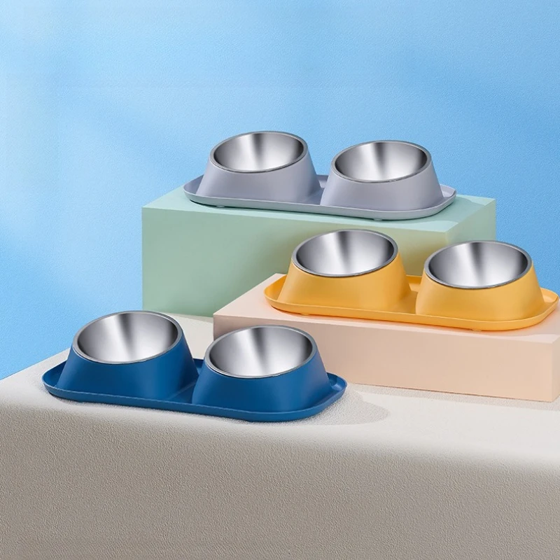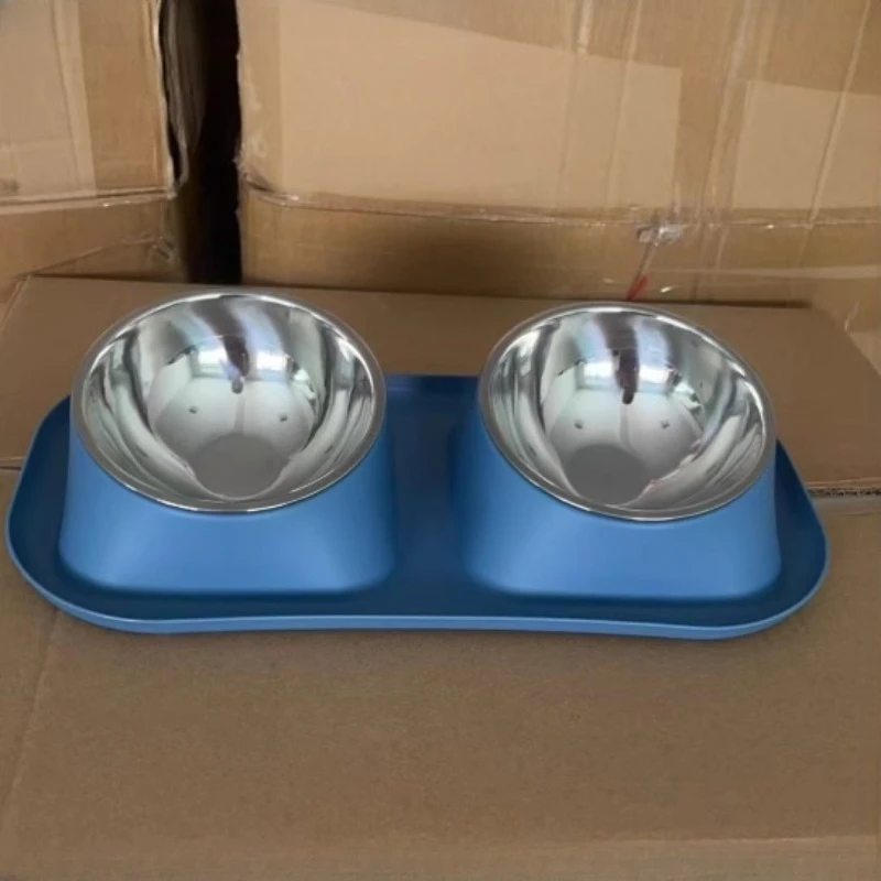 Cuenco doble elevado a prueba de desorden para mascotas, alimentador de agua y comida inclinado de acero inoxidable con base antideslizante para perros y gatos