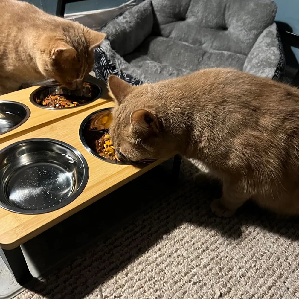 Cuenco elevado para gatos 15° Soporte inclinado con tazones y bandeja de acero inoxidable, tapete antideslizante incluido para los cómodos momentos de comida del gato