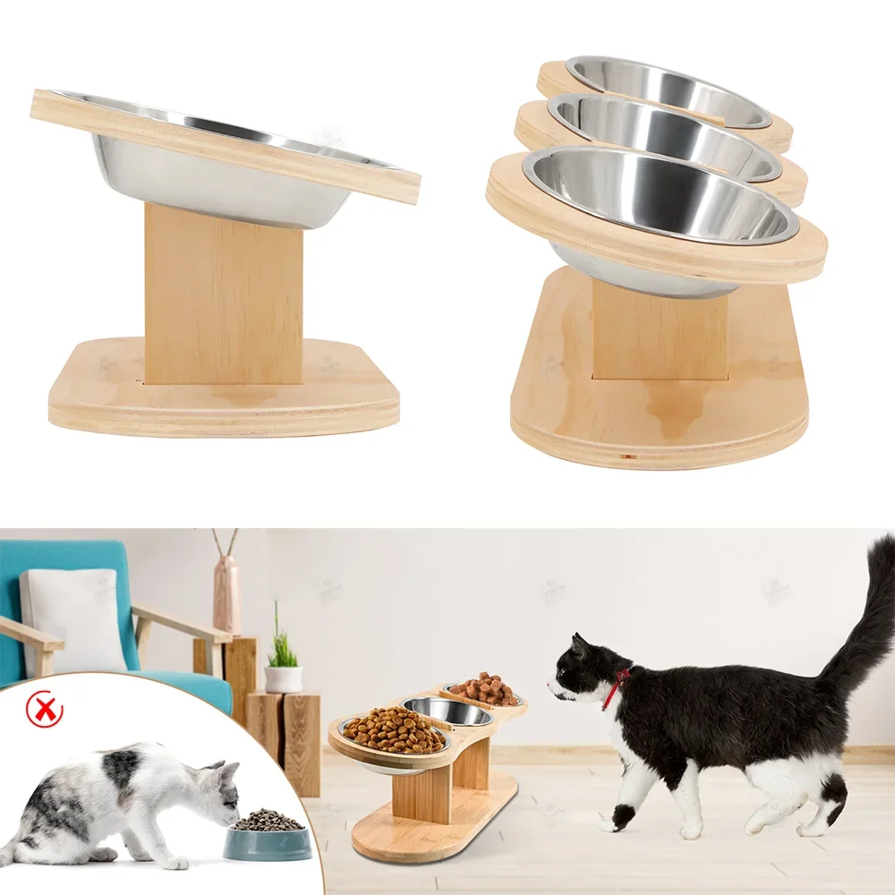 Cuenco elevado para gatos de 3 niveles con soportes de soporte, cuenco de comida para mascotas inclinado con soporte de ángulo ajustable de madera y acero inoxidable de 15 grados