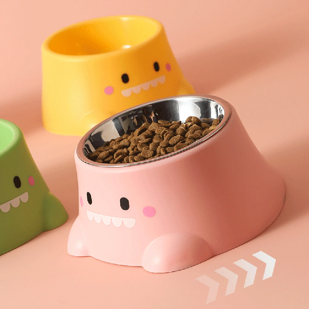 Cuenco para gatos con protección del cuello y pie alto con boca inclinada, bonito diseño de dinosaurio pequeño, cuenco individual para gatos/perros, cuenco de alimentación para mascotas