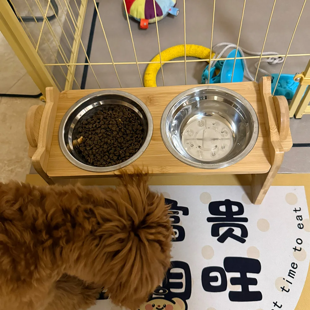 【Resistente y fácil de limpiar】La mano de obra de material natural proporciona al cuenco elevado para perros esquinas bien terminadas y una superficie lisa; Dos tazones de acero inoxidable son resistentes al óxido y aptos para lavavajillas para una fácil limpieza y mantenimiento.