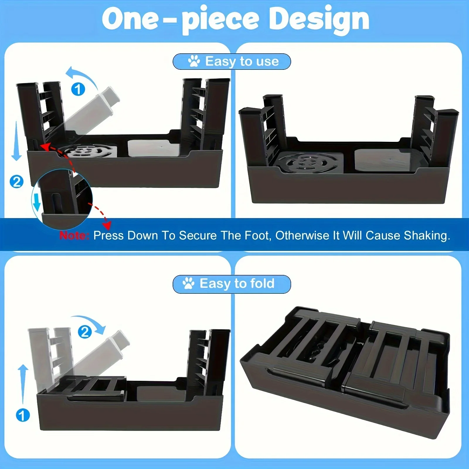 Fácil de instalar y extraíble: la estación elevada de tazones de agua y comida para perros de 4 alturas es fácil de montar sin necesidad de herramientas, y también simplemente se retira y dobla demasiado para un almacenamiento ordenado cuando no se usa. Además, las patas plegables facilitan su almacenamiento y transporte.