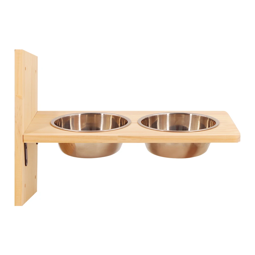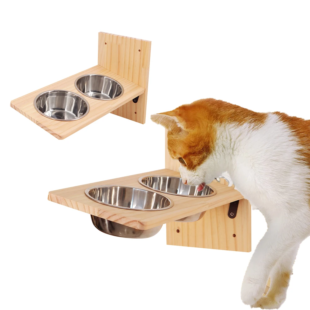 Cuencos elevados para gatos de acero inoxidable 15 montados en la pared° Cuencos elevados inclinados para mascotas con soporte de madera