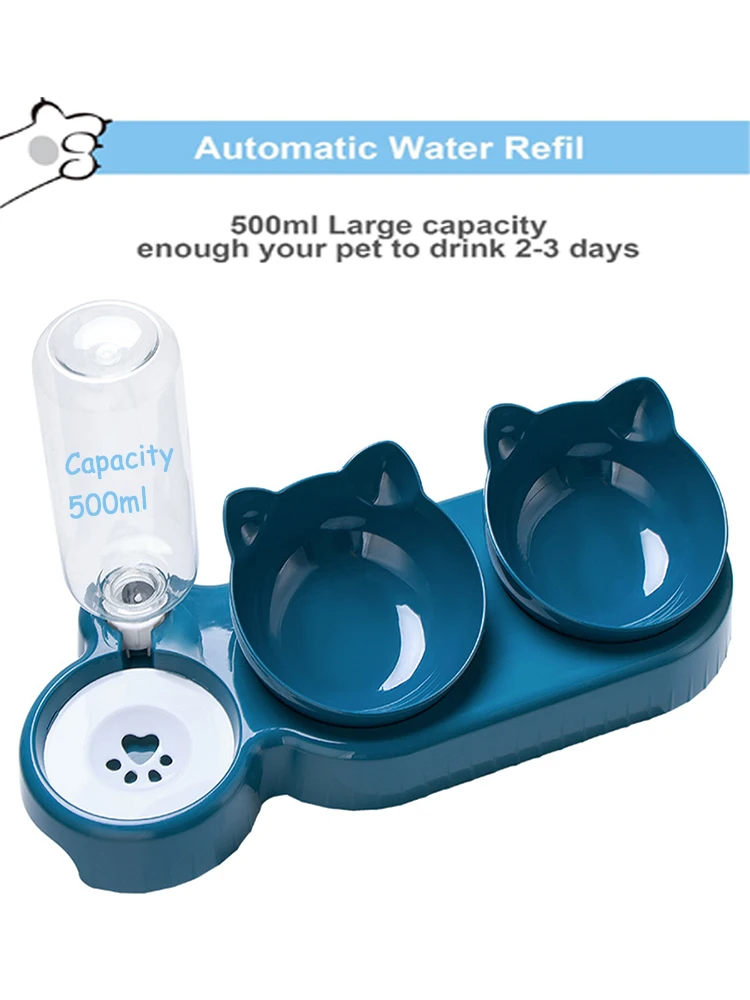 Cuencos triples para gatos, comedero para mascotas, cuencos dobles 2 en 1 con biberón automático, diseño inclinado y giratorio para gatos y perros