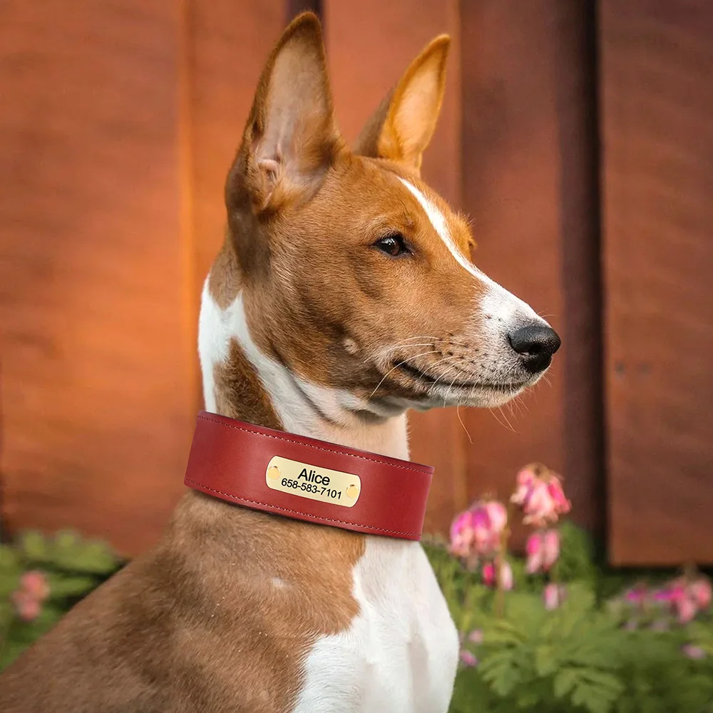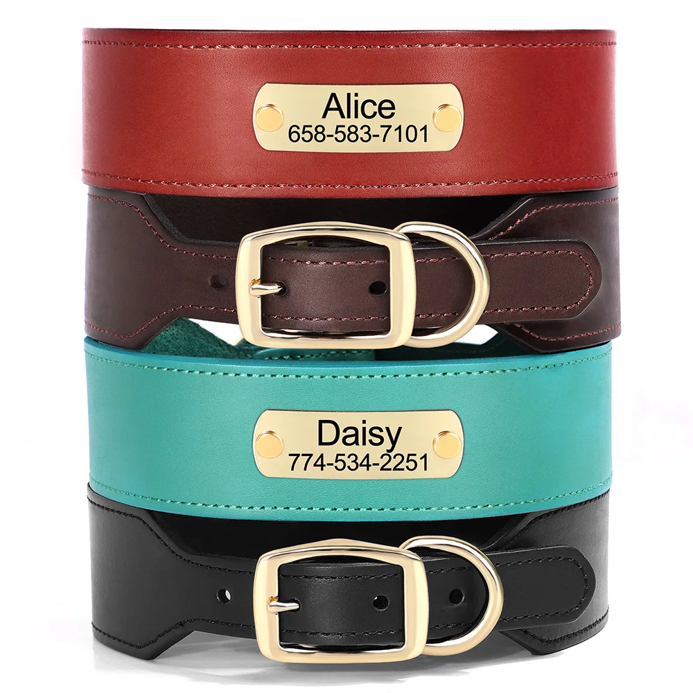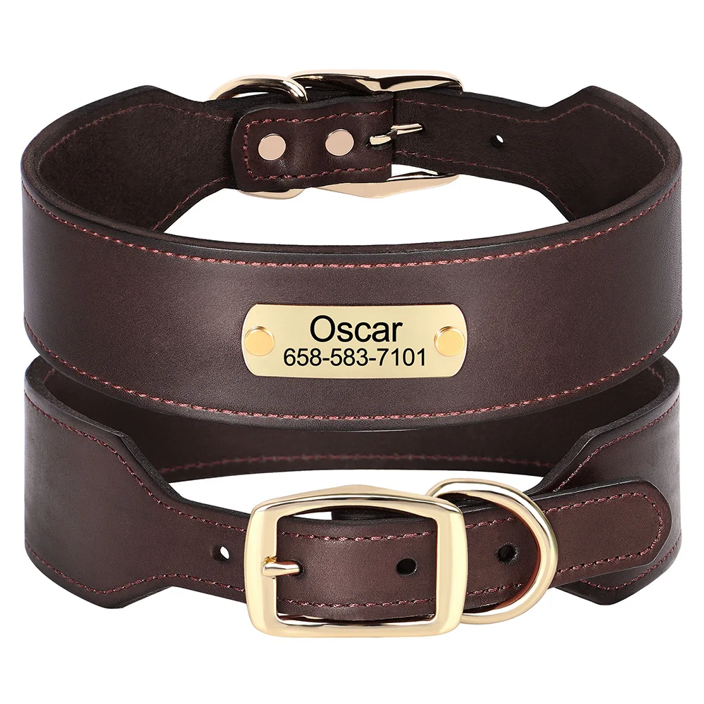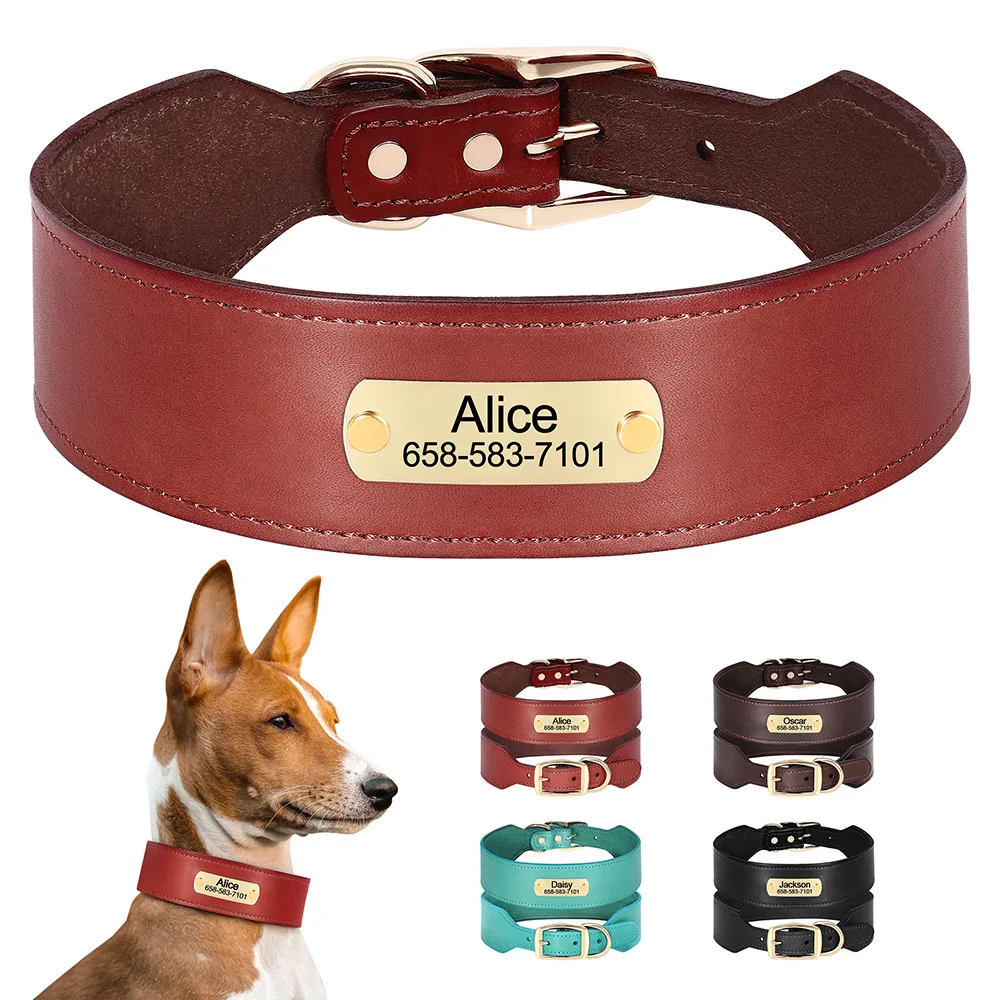 Collar de cuero para perro grabado personalizado, collares de cuero ancho para perros, nombre personalizado, placa de identificación antipérdida para perros grandes y grandes