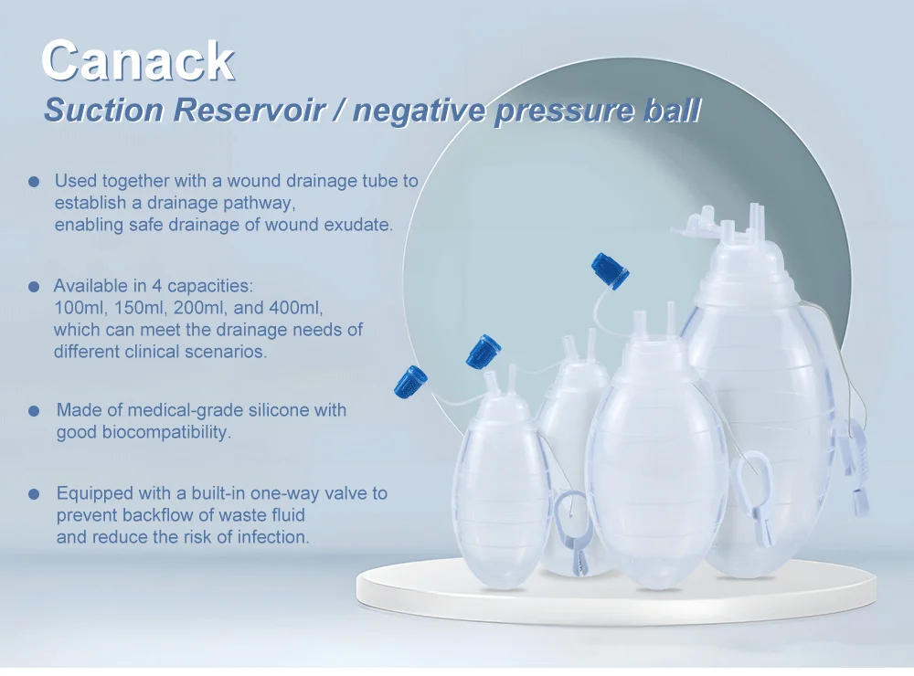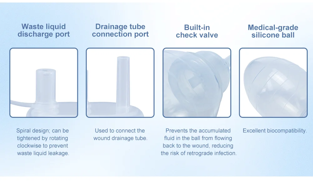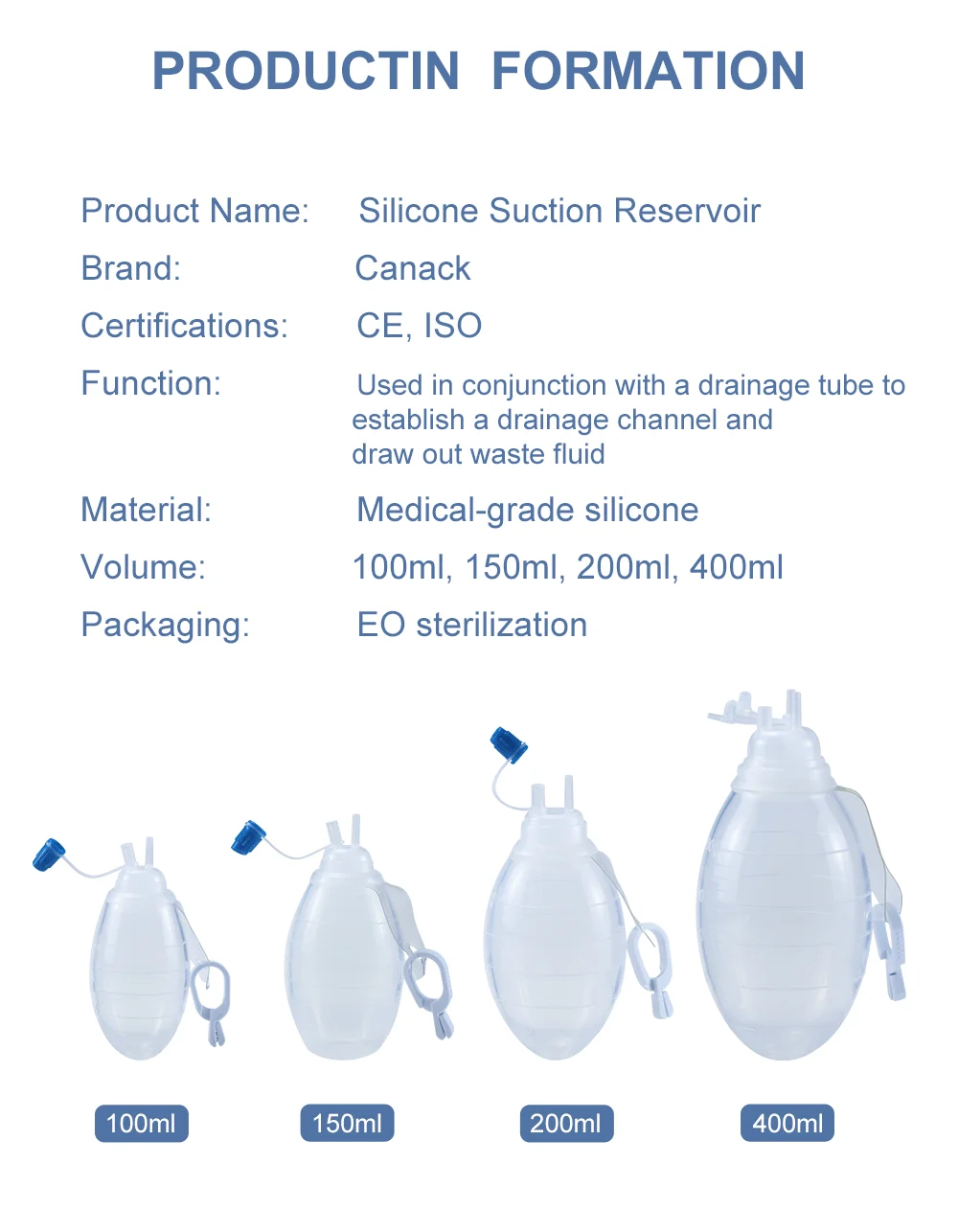 2.Disponible en 4 capacidades: 100 ml, 150 ml, 200 ml y 400 ml, que pueden satisfacer las necesidades de drenaje de diferentes escenarios clínicos.