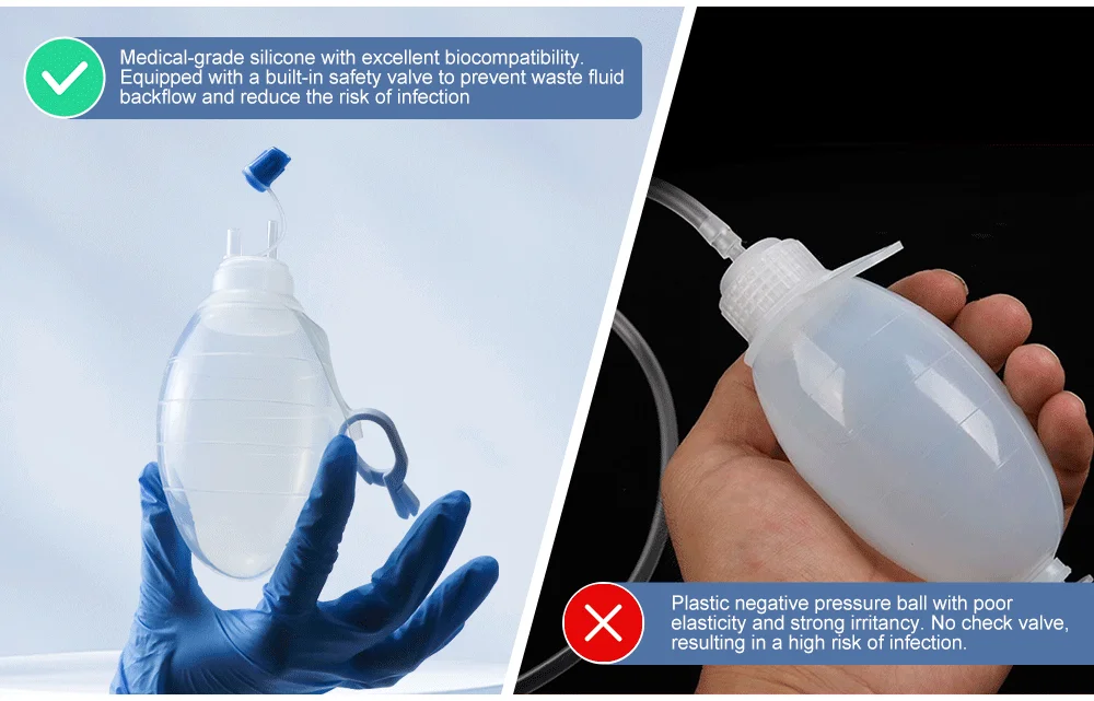 Bola de presión negativa de drenaje de silicona médica del depósito de succión 100ml-400ml con marcas de escala para equipos veterinarios del hospital de mascotas