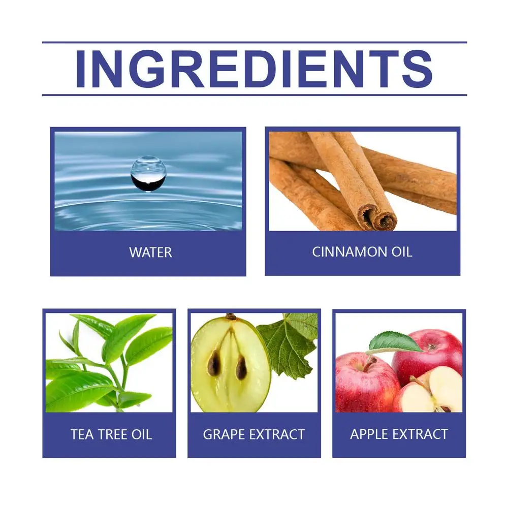 Ingredientes del producto: agua, aceite de canela, aceite de árbol de té, extracto de uva, etc.