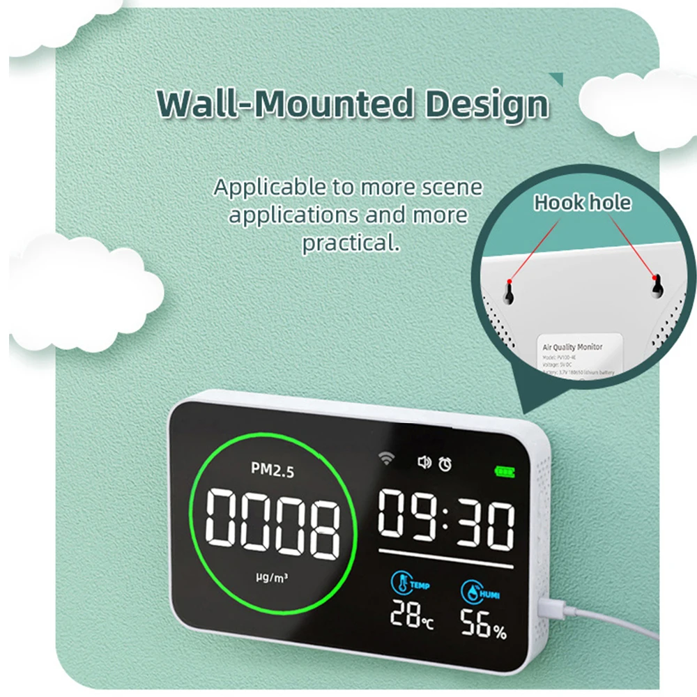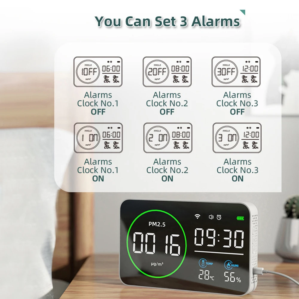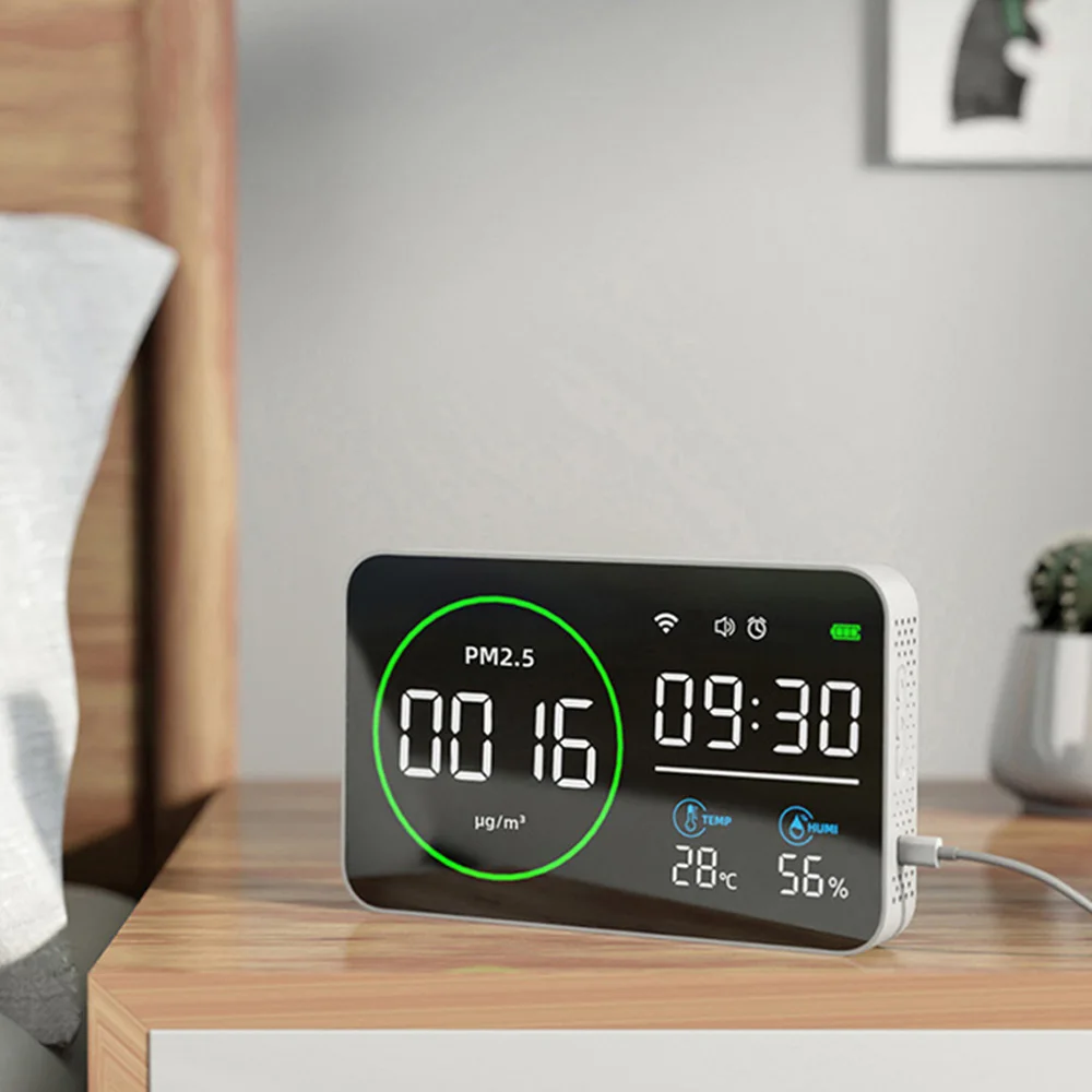 Detector inteligente de calidad del aire WiFi, Monitor PM2.5 de pantalla grande 4 en 1, PM2.5, probador de temperatura y humedad, despertador para el hogar