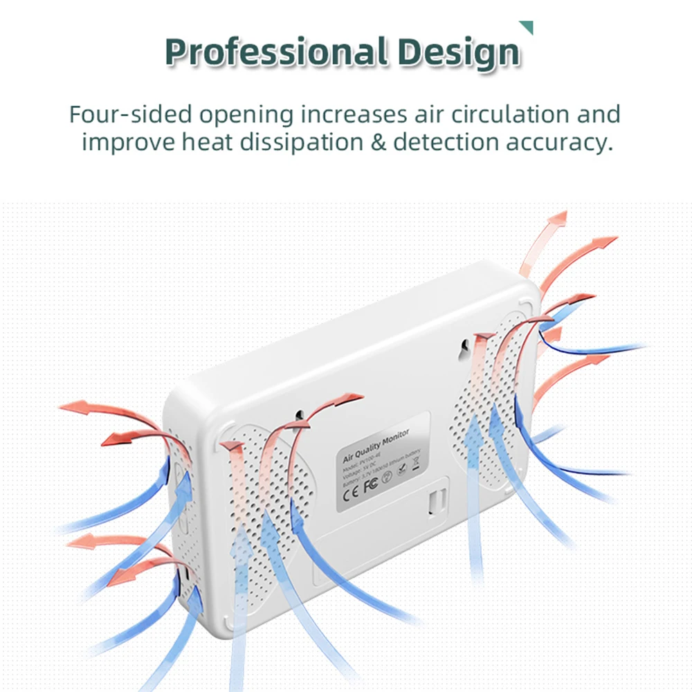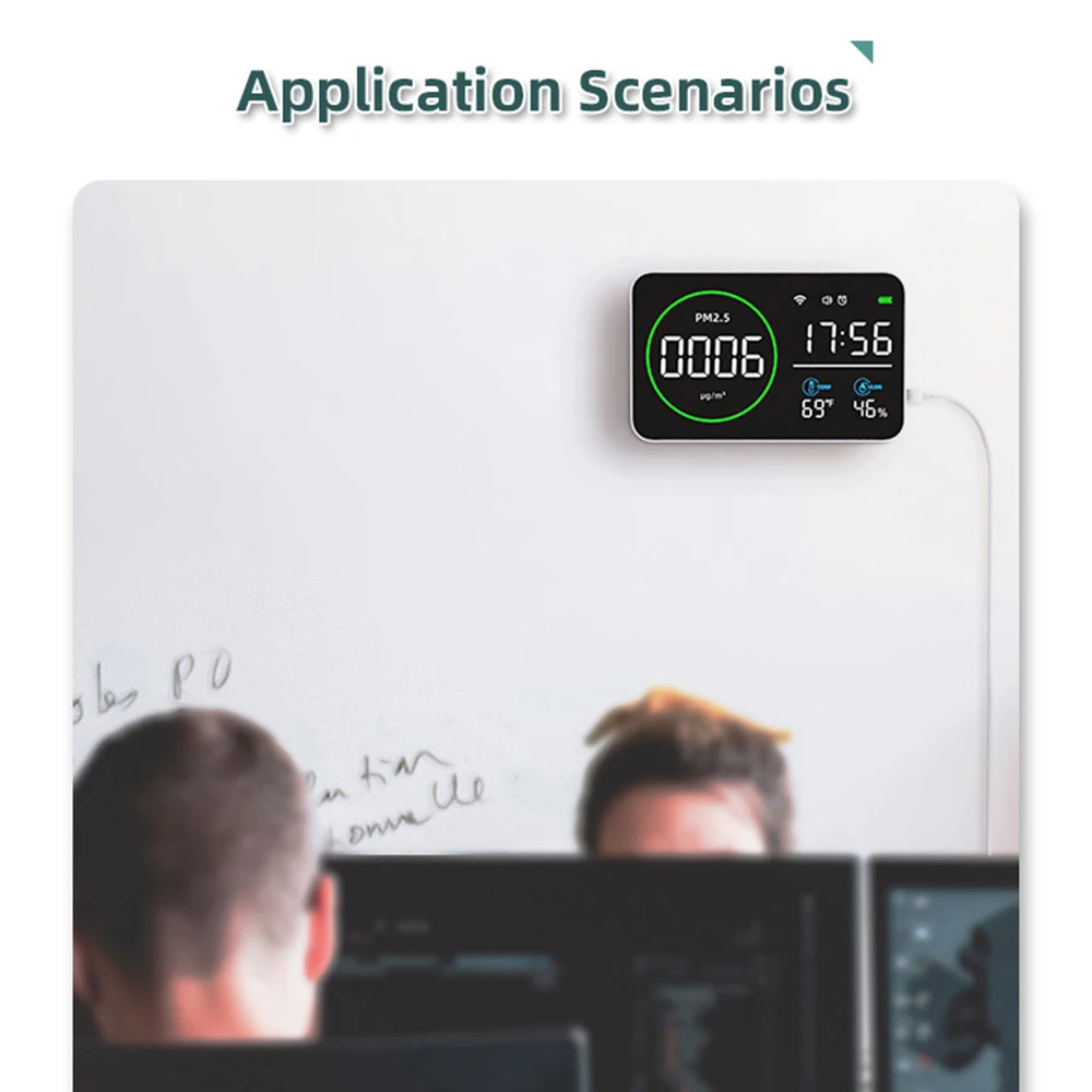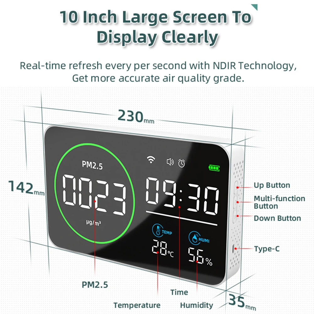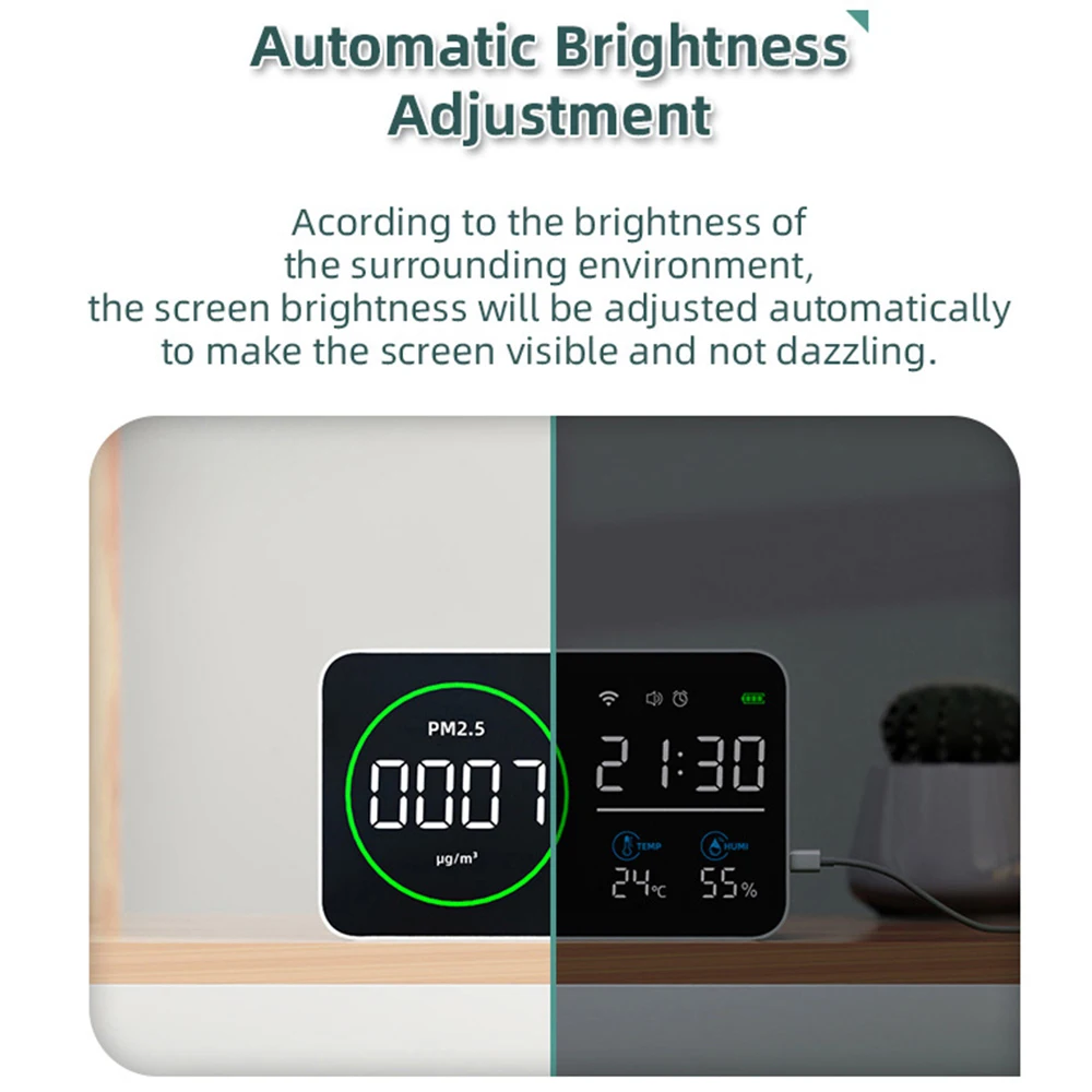 Detector inteligente de calidad del aire WiFi, Monitor PM2.5 de pantalla grande 4 en 1, PM2.5, probador de temperatura y humedad, despertador para el hogar