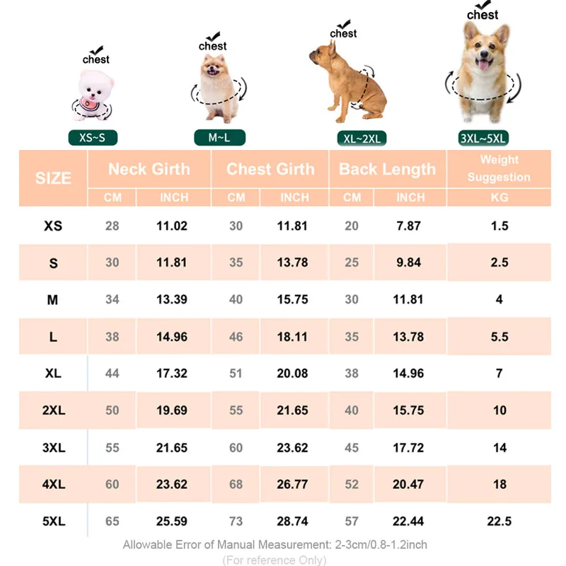 2.Para la ropa de dos piernas, preste atención a la circunferencia del pecho, y para las cuatro piernas, debe adaptarse a la circunferencia del pecho y la longitud de la espalda.