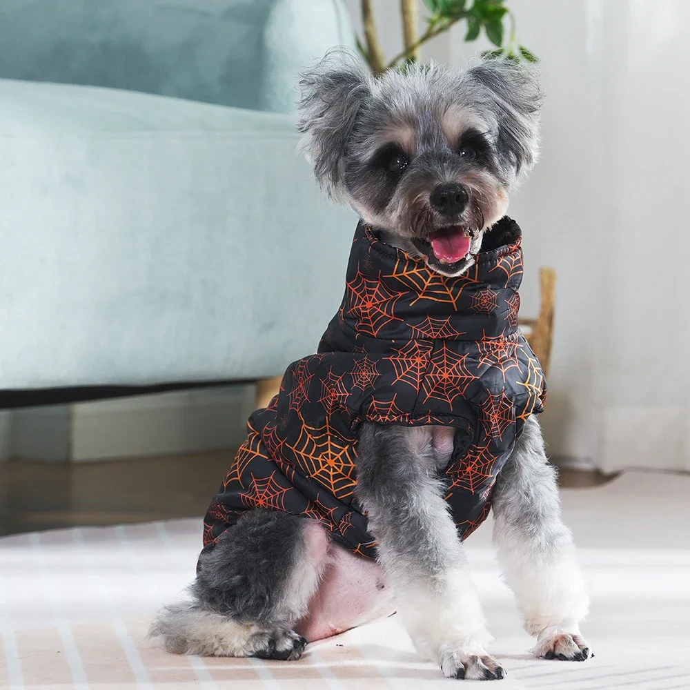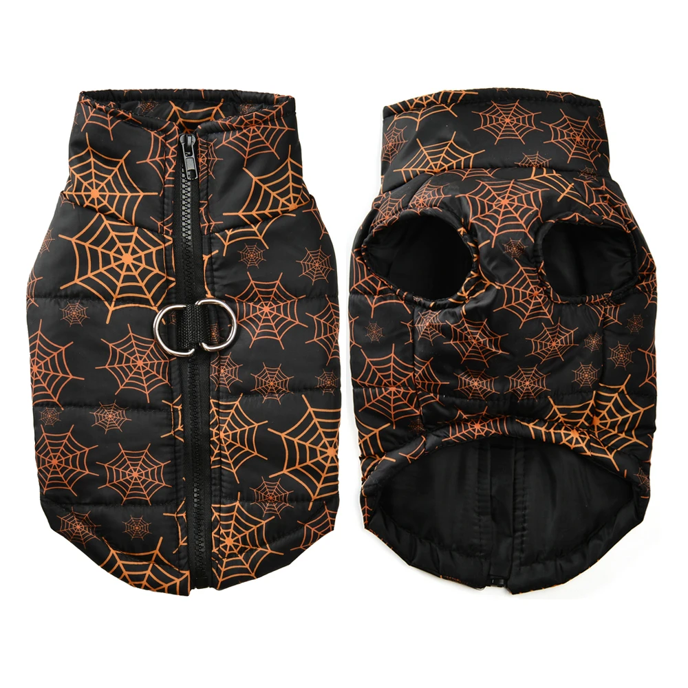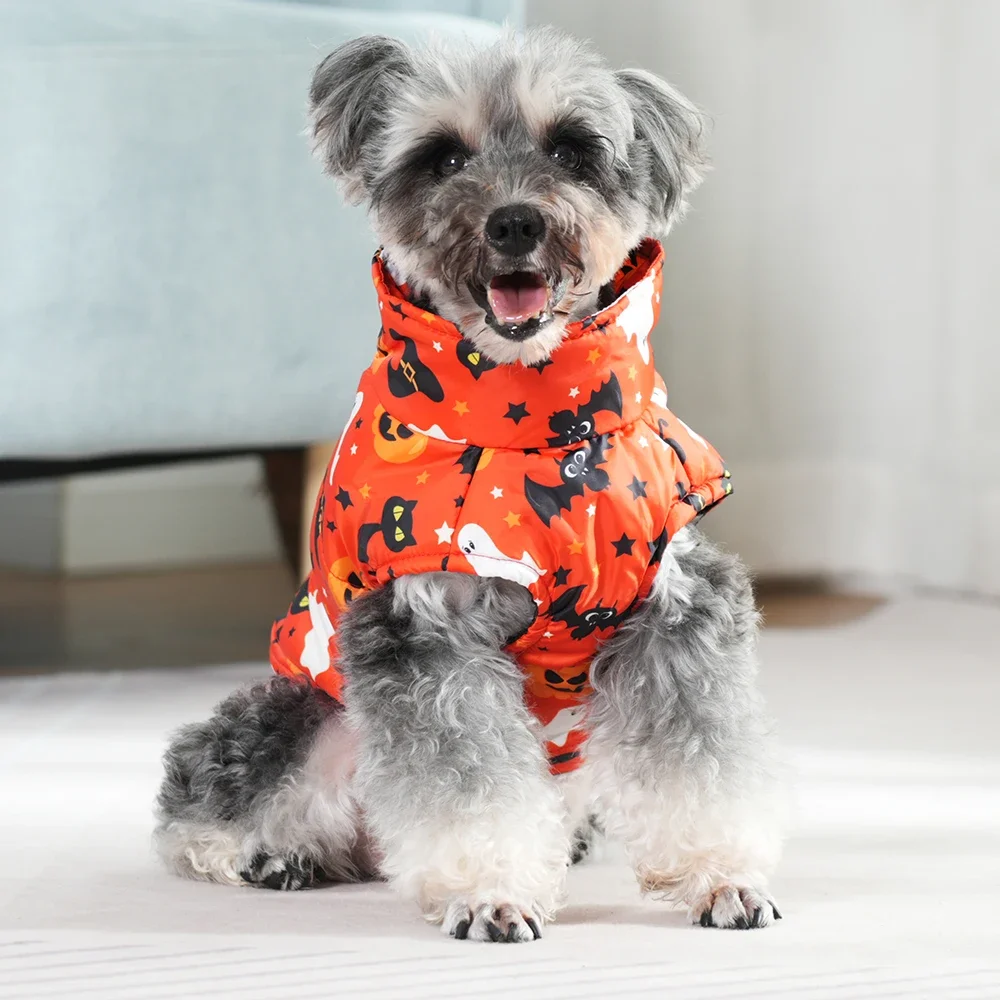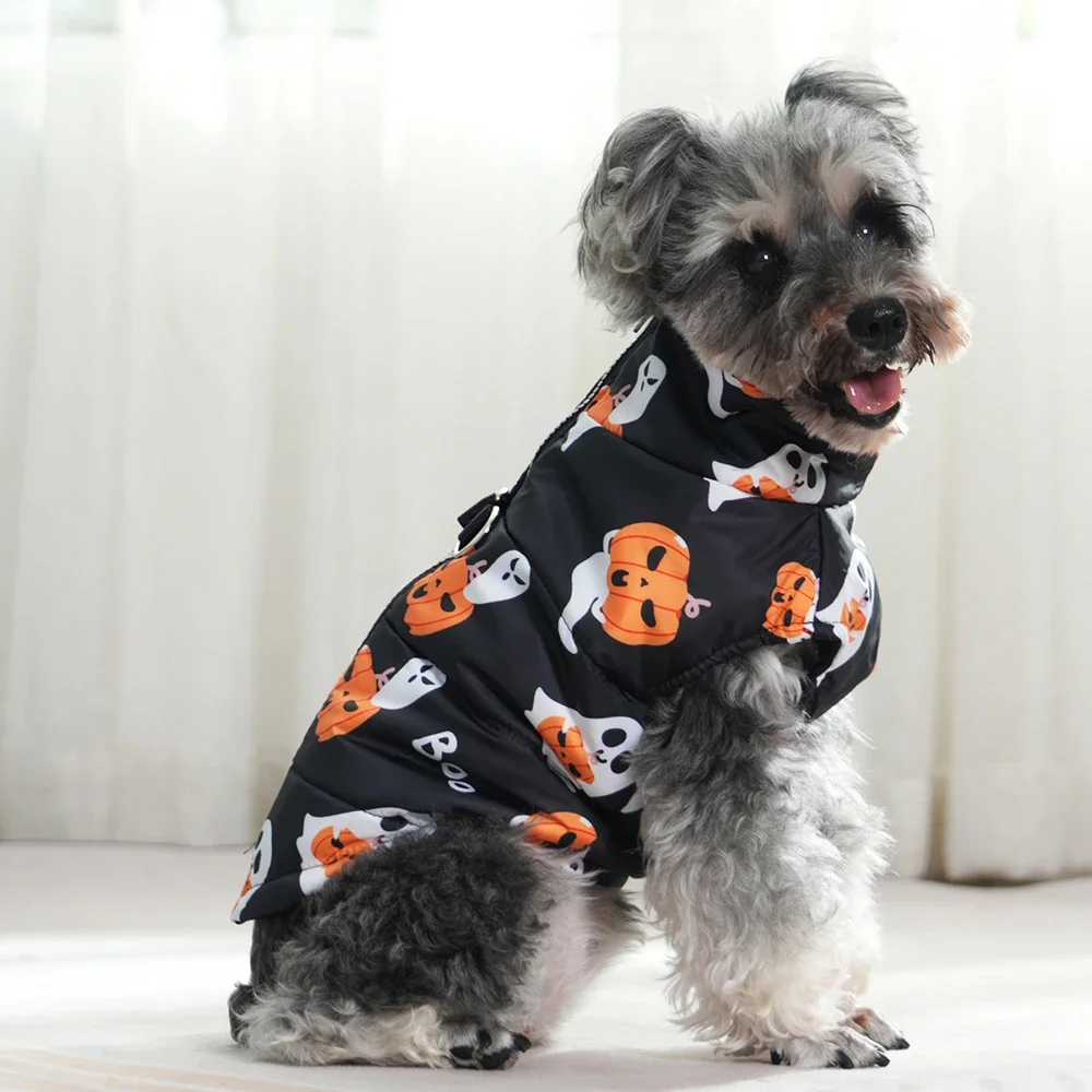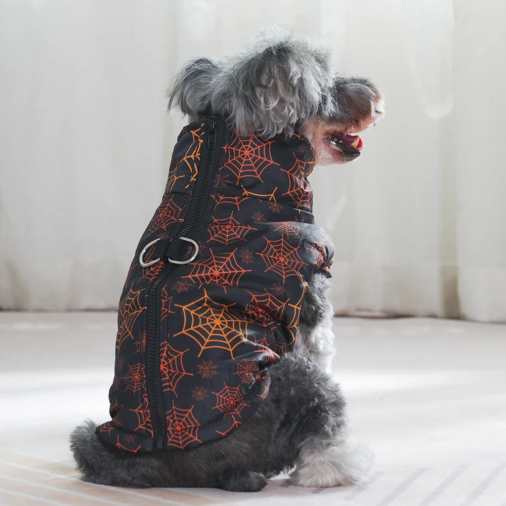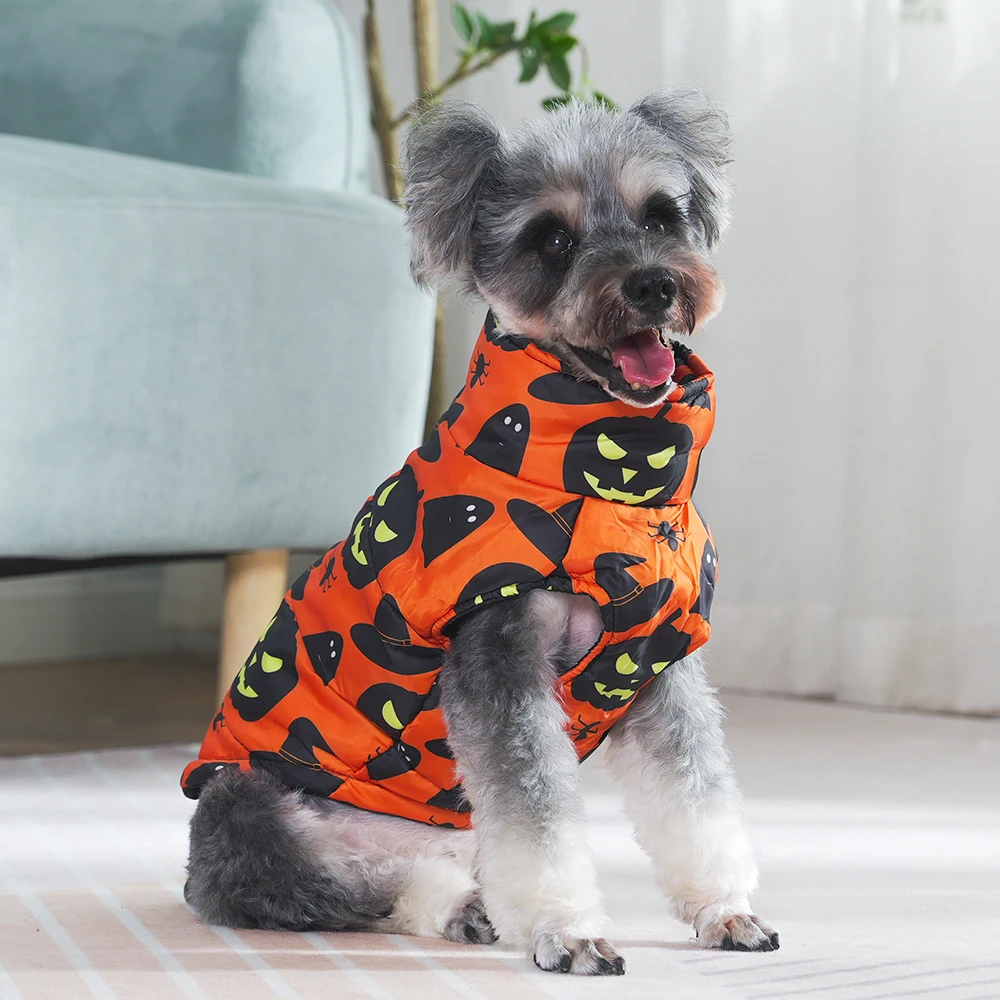 Disfraz de perro de Halloween, chaqueta cálida para otoño e invierno, ropa para perros pequeños y medianos, abrigo divertido con estampado de calabaza y cachorro con anillo en D
