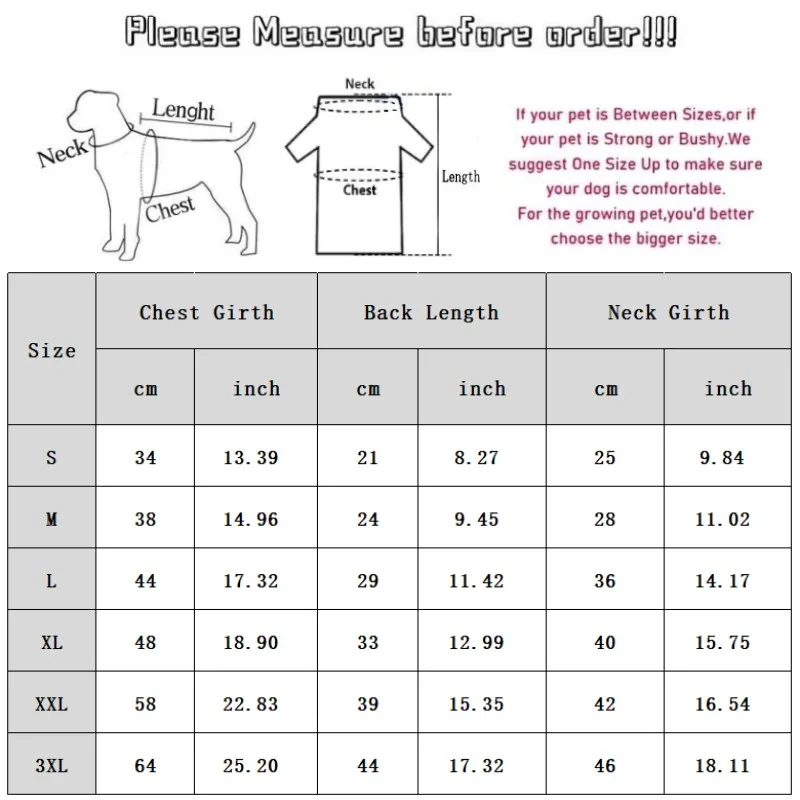 XL: Pecho 48 cm/18,90 pulgadas; Longitud 33 cm/12,99 pulgadas; Cuello 40 cm/15,75 pulgadas