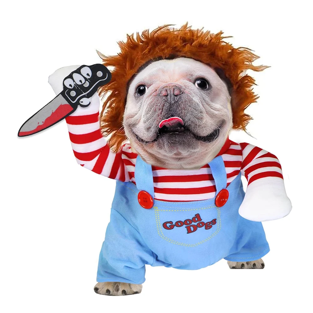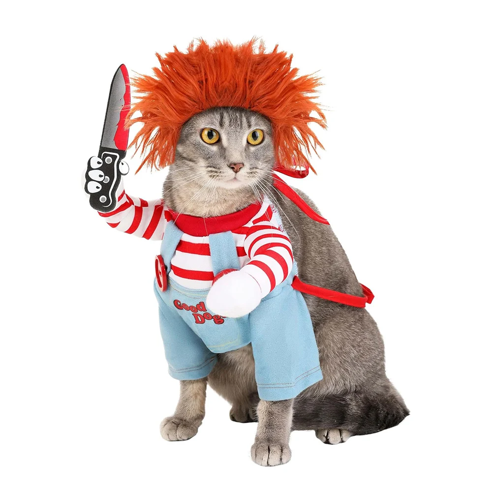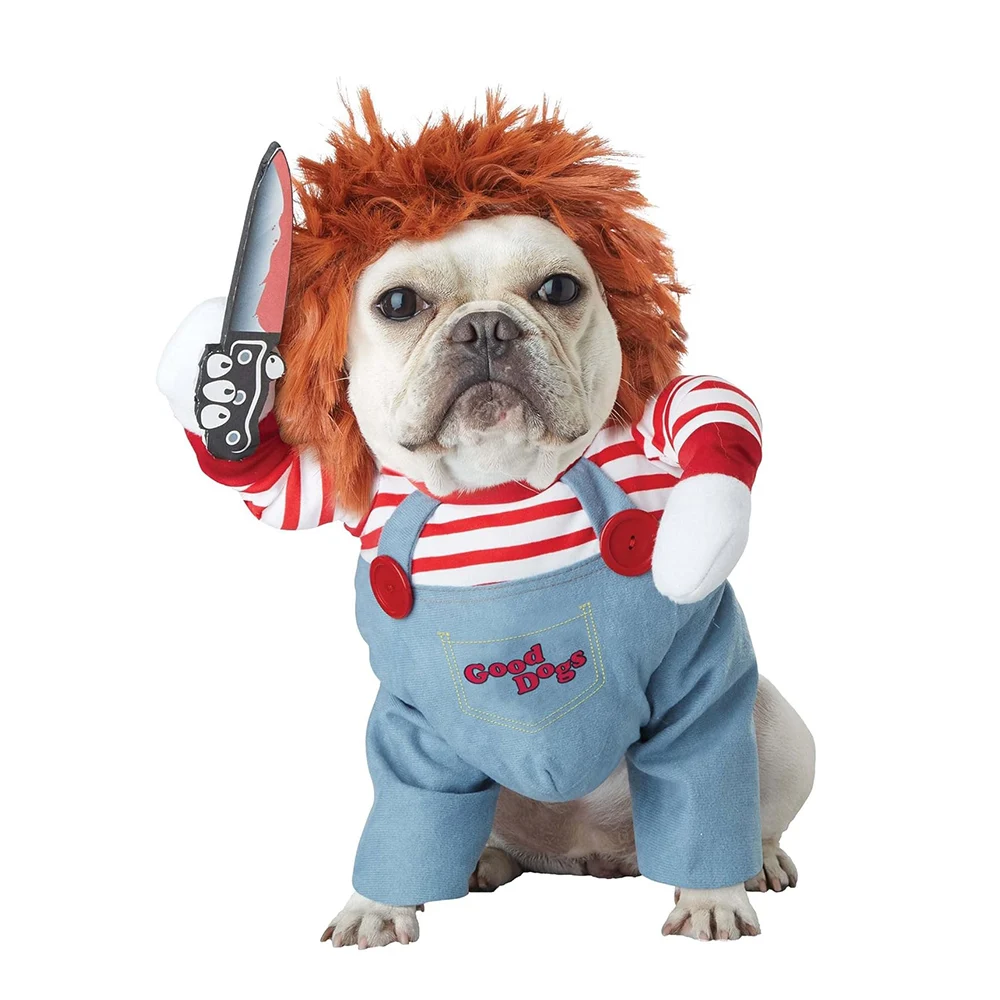 Disfraz de perro muñeca mortal para mascotas, divertido disfraz de Halloween, traje de Chucky para perros pequeños, medianos, gatos, cachorros, vestido de fiesta, ropa fresca